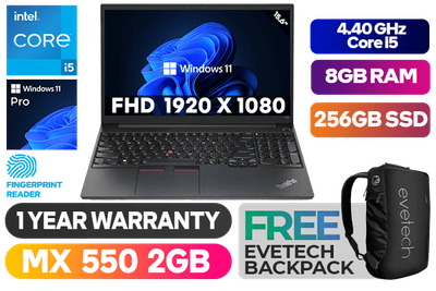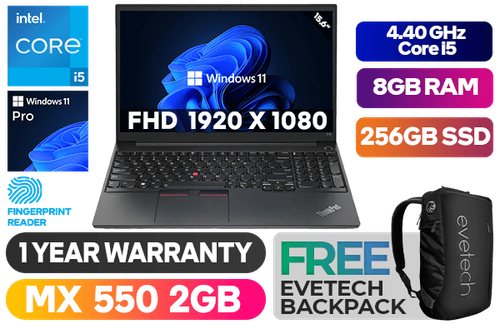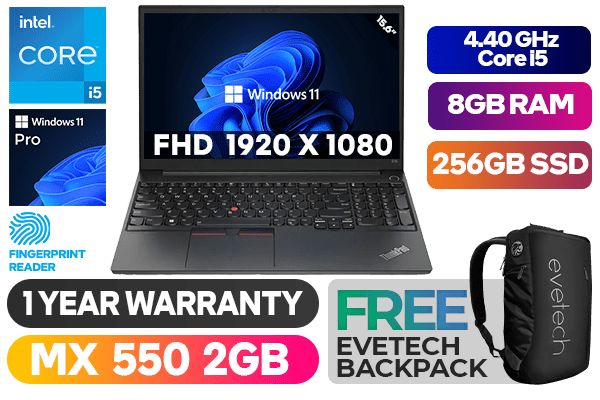 Lenovo ThinkPad E15 Gen 4 21E600B5ZA 12th Gen Intel Core i5-1235U up to 4.40GHz Processor, 12MB Cache, 10x Cores, 12x Threads / 8GB DDR4 RAM / 256GB Ultra-Fast NVME SSD / 15.6" FHD 1920 x 1080 Anti-Glare IPS-Level Display / NVIDIA Geforce MX550 2GB GDDR6 DirectX 12 Dedicated Graphics Card / No DVD Drive Included / <span style="font-size: 20px; color: #00BFFF; font-weight: bold;">Windows 11 Professional (64bit)</span> / FHD 1080p with Privacy Shutter / Bluetooth 5.1 / WiFi 6E AX211 Wireless LAN / Fingerprint Reader / 2x 2W Speaker With Dolby Audio / Headphone Audio & Microphone Combo Jack / 1x USB 3.2 Type-A / 1x USB 2.0 / 1x USB 4 Type-C Thunderbolt™ 4 (support data transfer, Power Delivery 3.0 and DisplayPort™ 1.4) / 1x HDMI / Non-backlit Keyboard / 1 Year Warranty / Lenovo ThinkPad E15 Gen 4 Core i5 MX550 Laptop DealLenovo ThinkPad E15 Gen 4 21E600B5ZA 12th Gen Intel Core i5-1235U up to 4.40GHz Processor, 12MB Cache, 10x Cores, 12x Threads / 8GB DDR4 RAM / 256GB Ultra-Fast NVME SSD / 15.6" FHD 1920 x 1080 Anti-Glare IPS-Level Display / NVIDIA Geforce MX550 2GB GDDR6 DirectX 12 Dedicated Graphics Card / No DVD Drive Included / Windows 11 Professional (64bit) / FHD 1080p with Privacy Shutter / Bluetooth 5.1 / WiFi 6E AX211 Wireless LAN / Fingerprint Reader / 2x 2W Speaker With Dolby Audio / Headphone Audio & Microphone Combo Jack / 1x USB 3.2 Type-A / 1x USB 2.0 / 1x USB 4 Type-C Thunderbolt™ 4 (support data transfer, Power Delivery 3.0 and DisplayPort™ 1.4) / 1x HDMI / Non-backlit Keyboard / 1 Year Warranty / Lenovo ThinkPad E15 Gen 4 Core i5 MX550 Laptop Deal [21E600B5ZA] / [+] GET FREE EVETECH NEO Premium Gaming Backpack+ FREE DELIVERY !