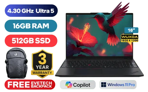 Lenovo ThinkPad L16 G1 Intel® Core™ Ultra 5-125U up to 4.30GHz Processor, 12MB Cache, 12x Cores, 14x Threads / 16GB DDR5 RAM / 512GB Ultra-Fast NVME SSD / 16” WUXGA (1920 x 1200) IPS-Level Display / Integrated Intel Graphics / <span style="font-size: 20px; color: #00BFFF; font-weight: bold;">Windows 11 Professional (64bit)</span> / Intel Wi-Fi 6E AX211 Wireless LAN / Bluetooth 5.3 / 5.0MP RGB + IR Camera with Privacy Shutter / 3x USB Type-A / 2x USB Type-C (Thuderbolt 4 / DisplayPort ) / 1x HDMI / 1x RJ45 Port / 1x LTE SIM Slot / 1x Headphone & Microphone Combo Jack / White Backlit Keyboard / Built-In Speakers with Dolby Audio / Lenovo ThinkPad L16 G1 Intel® Core™ Ultra 5 Laptop DealLenovo ThinkPad L16 G1 Intel® Core™ Ultra 5-125U up to 4.30GHz Processor, 12MB Cache, 12x Cores, 14x Threads / 16GB DDR5 RAM / 512GB Ultra-Fast NVME SSD / 16” WUXGA (1920 x 1200) IPS-Level Display / Integrated Intel Graphics / Windows 11 Professional (64bit) / Intel Wi-Fi 6E AX211 Wireless LAN / Bluetooth 5.3 / 5.0MP RGB + IR Camera with Privacy Shutter / 3x USB Type-A / 2x USB Type-C (Thuderbolt 4 / DisplayPort ) / 1x HDMI / 1x RJ45 Port / 1x LTE SIM Slot / 1x Headphone & Microphone Combo Jack / White Backlit Keyboard / Built-In Speakers with Dolby Audio / Lenovo ThinkPad L16 G1 Intel® Core™ Ultra 5 Laptop Deal [21L4S6LS00] / 3 YEARS WARRANTY / [+] GET FREE EVETECH FLUX Premium Gaming Backpack+ FREE DELIVERY !
