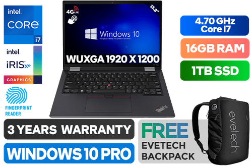 [<span style="color:#ea0303; font-weight:bold;">4G LTE</span>] [<span style="color:red; font-size:18px;">TOUCHSCREEN</span>] Lenovo ThinkPad X13 Yoga Gen 3 21AW001BZA 12th Gen Intel Alder Lake Core i7-1255U up to 4.70GHz Processor, 12MB Cache, 10x Cores, 12x Threads / 16GB LPDDR4x RAM / 1TB Ultra-Fast NVME SSD / 13.3" WUXGA (1920 x 1200) Touch Screen Display / Integrated Intel Iris Xe Graphics, DirectX 12 Support / No DVD Drive Included / <span style="color:red; font-size:18px;">Windows 10 Professional (64bit)</span> / FHD 1080P Web Camera / Bluetooth 5.1 / Dual Band Intel AX211 Wi-Fi 6E Wireless LAN / 2x 2W Speaker With Dolby Audio / 1x Headphone and Microphone Combo Jack / 2x USB 3.2 Type-A / 2x USB 4 Type-C Thunderbolt™ 4 (Power Delivery 3.0 and DisplayPort™ 1.4) / 1x HDMI / 1x Nano-SIM Card Slot / 1x Smart Card Reader / <span style="color:green; font-size: 20px;">Fingerprint Reader</span> / White-backlit Keyboard / Lenovo® Integrated Stylus Pen / Lenovo ThinkPad X13 Yoga Gen 3 Core i7 Laptop Deal[4G LTE] [TOUCHSCREEN] Lenovo ThinkPad X13 Yoga Gen 3 21AW001BZA 12th Gen Intel Alder Lake Core i7-1255U up to 4.70GHz Processor, 12MB Cache, 10x Cores, 12x Threads / 16GB LPDDR4x RAM / 1TB Ultra-Fast NVME SSD / 13.3" WUXGA (1920 x 1200) Touch Screen Display / Integrated Intel Iris Xe Graphics, DirectX 12 Support / No DVD Drive Included / Windows 10 Professional (64bit) / FHD 1080P Web Camera / Bluetooth 5.1 / Dual Band Intel AX211 Wi-Fi 6E Wireless LAN / 2x 2W Speaker With Dolby Audio / 1x Headphone and Microphone Combo Jack / 2x USB 3.2 Type-A / 2x USB 4 Type-C Thunderbolt™ 4 (Power Delivery 3.0 and DisplayPort™ 1.4) / 1x HDMI / 1x Nano-SIM Card Slot / 1x Smart Card Reader / Fingerprint Reader / White-backlit Keyboard / Lenovo® Integrated Stylus Pen / Lenovo ThinkPad X13 Yoga Gen 3 Core i7 Laptop Deal [21AW001BZA] / 3 YEARS WARRANTY / [+] GET FREE EVETECH NEO Premium Gaming Backpack+ FREE DELIVERY !