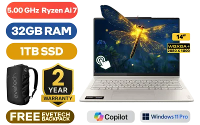 [TOUCHSCREEN] Lenovo Yoga 7 2-In-1 14AKP10 AMD Ryzen AI 7 350 up to 5.00GHz Processor, 24MB Cache, 8x Cores, 16x Threads / 32GB LPDDR5X RAM / 1TB Ultra-fast NVMe SSD / 14” WQXGA+ (2880 x1 800) OLED Touchscreen Display / Integrated AMD Radeon Graphics / <span style="color:blue; font-size: 17px;">Windows 11 Professional (64bit)</span> / MediaTek Wi-Fi 7 MT7925 Wireless LAN / Bluetooth 5.4 / 5MP IR Camera With Privacy shutter / 1x USB Type-A / 2x USB Type-C (Supports Power Delivery 3.1 / DisplayPort™) / 1x HDMI / 1x Headphone and Microphone Combo Jack / 1x MicroSD Card Reader / White Backlit Keyboard / 4 Stereo Speakers with Dolby Atmos Audio / FREE Lenovo® Yoga Pen / FREE Lenovo® YOGA Sleeve (Luna Grey) / 2 Years Warranty / Lenovo Yoga 7 14AKP10 2-in-1 Ryzen AI 7 Touchscreen Laptop[TOUCHSCREEN] Lenovo Yoga 7 2-In-1 14AKP10 AMD Ryzen AI 7 350 up to 5.00GHz Processor, 24MB Cache, 8x Cores, 16x Threads / 32GB LPDDR5X RAM / 1TB Ultra-fast NVMe SSD / 14” WQXGA+ (2880 x1 800) OLED Touchscreen Display / Integrated AMD Radeon Graphics / Windows 11 Professional (64bit) / MediaTek Wi-Fi 7 MT7925 Wireless LAN / Bluetooth 5.4 / 5MP IR Camera With Privacy shutter / 1x USB Type-A / 2x USB Type-C (Supports Power Delivery 3.1 / DisplayPort™) / 1x HDMI / 1x Headphone and Microphone Combo Jack / 1x MicroSD Card Reader / White Backlit Keyboard / 4 Stereo Speakers with Dolby Atmos Audio / FREE Lenovo® Yoga Pen / FREE Lenovo® YOGA Sleeve (Luna Grey) / 2 Years Warranty / Lenovo Yoga 7 14AKP10 2-in-1 Ryzen AI 7 Touchscreen Laptop [83JR004MSA] / [+] GET FREE EVETECH NEO Premium Gaming Backpack+ FREE DELIVERY !