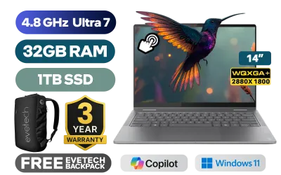 [TOUCHSCREEN] Lenovo Yoga 7 2-In-1 14ILL10 Intel® Core™ Ultra 7-258V up to 4.8GHz Processor, 12MB Cache, 8x Cores, 8x Threads / 32GB LPDDR5X RAM / 1TB Ultra-fast NVMe SSD / 14” WQXGA+ (2880x1800) OLED Display / Integrated Intel Arc 140V Graphics / Windows 11 Home (64bit) / Intel Wi-Fi 7 BE201 Wireless LAN / Bluetooth 5.4 / 5.0MP IR Camera With Privacy shutter / 1x USB Type-A / 2x USB Type-C (Supports Thunderbolt 4 / DisplayPort 2.1 / Power Delivery) / 1x HDMI / 1x Headphone & Microphone Combo Jack / 1x MicroSD Card Reader / White Backlit Keyboard / 4 Stereo Speakers Optimized with Dolby Atmos Audio / Free Lenovo® Yoga Pen / Lenovo Yoga 7 14ILL10 Core Ultra 7 Laptop Deals[TOUCHSCREEN] Lenovo Yoga 7 2-In-1 14ILL10 Intel® Core™ Ultra 7-258V up to 4.8GHz Processor, 12MB Cache, 8x Cores, 8x Threads / 32GB LPDDR5X RAM / 1TB Ultra-fast NVMe SSD / 14” WQXGA+ (2880x1800) OLED Display / Integrated Intel Arc 140V Graphics / Windows 11 Home (64bit) / Intel Wi-Fi 7 BE201 Wireless LAN / Bluetooth 5.4 / 5.0MP IR Camera With Privacy shutter / 1x USB Type-A / 2x USB Type-C (Supports Thunderbolt 4 / DisplayPort 2.1 / Power Delivery) / 1x HDMI / 1x Headphone & Microphone Combo Jack / 1x MicroSD Card Reader / White Backlit Keyboard / 4 Stereo Speakers Optimized with Dolby Atmos Audio / Free Lenovo® Yoga Pen / Lenovo Yoga 7 14ILL10 Core Ultra 7 Laptop Deals [83JQ00CUSA] / [+] GET FREE EVETECH NEO Premium Gaming Backpack / 3 YEARS WARRANTY + FREE DELIVERY !