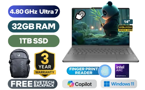 [TOUCHSCREEN] Lenovo Yoga 9 2-In-1 14ILL10 Intel® Core™ Ultra 7-258V up to 4.80GHz Processor, 12MB Cache, 8x Cores, 8x Threads / 32GB LPDDR5x RAM / 1TB Ultra-fast NVMe SSD / 14” WQUXGA (3840x2400) OLED Touchscreen Display / Integrated Intel Arc Graphics / Windows 11 Home (64bit) / Intel WiFi 7 BE201 Wireless LAN / Bluetooth 5.4 / 1080p FHD IR Camera with Privacy Shutter / 1x USB Type-A / 3x USB Type-C (Supports Thunderbolt 4 / DisplayPort / Power Delivery) / 1x Headphone and Microphone Combo Jack / Finger Print Reader / White Backlit Keyboard / 4 Stereo Speakers optimized with Dolby Atmos Audio / Lenovo Yoga 9 Intel® Core™ Ultra 7 Touchscreen Laptop Deal[TOUCHSCREEN] Lenovo Yoga 9 2-In-1 14ILL10 Intel® Core™ Ultra 7-258V up to 4.80GHz Processor, 12MB Cache, 8x Cores, 8x Threads / 32GB LPDDR5x RAM / 1TB Ultra-fast NVMe SSD / 14” WQUXGA (3840x2400) OLED Touchscreen Display / Integrated Intel Arc Graphics / Windows 11 Home (64bit) / Intel WiFi 7 BE201 Wireless LAN / Bluetooth 5.4 / 1080p FHD IR Camera with Privacy Shutter / 1x USB Type-A / 3x USB Type-C (Supports Thunderbolt 4 / DisplayPort / Power Delivery) / 1x Headphone and Microphone Combo Jack / Finger Print Reader / White Backlit Keyboard / 4 Stereo Speakers optimized with Dolby Atmos Audio / Lenovo Yoga 9 Intel® Core™ Ultra 7 Touchscreen Laptop Deal [83LC005QSA] / 3 YEARS WARRANTY / [+] GET FREE EVETECH FLUX Premium Gaming Backpack+ FREE DELIVERY !