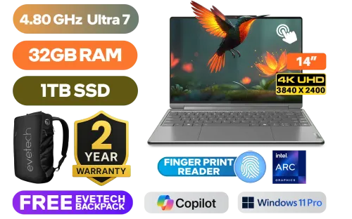[TOUCHSCREEN] Lenovo Yoga 9 2-In-1 14IMH9 Intel® Core™ Ultra 7-155H up to 4.80GHz Processor, 24MB Cache, 16x Cores, 22x Threads / 32GB LPDDR5X RAM / 1TB Ultra-fast NVMe SSD / 14” 4K (3840x2400) OLED Touchscreen Display / Intel Arc Integrated Graphics / <span style="color:r#00BFFF; font-size:18px;">Windows 11 Professional (64bit)</span> / 5MP IR Web Camera With Privacy Shutter / White Backlit Keyboard / Fingerprint Reader / Bluetooth 5.3 / Intel WiFi 6E AX211 Wireless LAN / Dolby Atmos™ speaker system / 1x USB Type-A / 3x USB Type-C / 1x Headphone and Microphone Combo Jack / Free Lenovo Slim Pen / Free USB-C 3-in-1 Hub / Free Yoga Slim Mouse / Free Lenovo YOGA 14-inch Sleeve (Luna Grey) / 2 Years Warranty / Lenovo Yoga 9 Intel® Core™ Ultra 7 Touchscreen 2-in-1 Laptop[TOUCHSCREEN] Lenovo Yoga 9 2-In-1 14IMH9 Intel® Core™ Ultra 7-155H up to 4.80GHz Processor, 24MB Cache, 16x Cores, 22x Threads / 32GB LPDDR5X RAM / 1TB Ultra-fast NVMe SSD / 14” 4K (3840x2400) OLED Touchscreen Display / Intel Arc Integrated Graphics / Windows 11 Professional (64bit) / 5MP IR Web Camera With Privacy Shutter / White Backlit Keyboard / Fingerprint Reader / Bluetooth 5.3 / Intel WiFi 6E AX211 Wireless LAN / Dolby Atmos™ speaker system / 1x USB Type-A / 3x USB Type-C / 1x Headphone and Microphone Combo Jack / Free Lenovo Slim Pen / Free USB-C 3-in-1 Hub / Free Yoga Slim Mouse / Free Lenovo YOGA 14-inch Sleeve (Luna Grey) / 2 Years Warranty / Lenovo Yoga 9 Intel® Core™ Ultra 7 Touchscreen 2-in-1 Laptop [83AC004KSA-2YRS ] / [+] GET FREE EVETECH NEO Premium Gaming Backpack+ FREE DELIVERY !