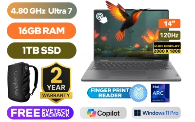 [TOUCHSCREEN] Lenovo Yoga 9 2-In-1 14IMH9 Intel® Core™ Ultra 7-155H up to 4.80GHz Processor, 24MB Cache, 16x Cores, 22x Threads / 16GB LPDDR5X RAM / 1TB Ultra-fast NVMe SSD / 14” 2.8K (2880x1800) 120Hz OLED Touchscreen Display / Intel Arc Integrated Graphics / <span style="color:r#00BFFF; font-size:18px;">Windows 11 Professional (64bit)</span> / 5MP IR Web Camera With Privacy Shutter / White Backlit Keyboard / Fingerprint Reader / Bluetooth 5.3 / Intel Wi-Fi 6E AX211 Wireless LAN / 1x USB Type-A / 1x USB Type-C with (USB PD 3.0 and DisplayPort™ 1.4) / 2x USB Type-C Thunderbolt™ 4 with (USB PD 3.0 and DisplayPort™ 1.4) / 1x Headphone and Microphone Combo Jack / Realtek ALC3306 Audio / Free Lenovo Slim Pen / Free USB-C 3-in-1 Hub / 2 Years Warranty / Lenovo Yoga 9 Intel® Core™ Ultra 7 Touchscreen 2-in-1 Laptop[TOUCHSCREEN] Lenovo Yoga 9 2-In-1 14IMH9 Intel® Core™ Ultra 7-155H up to 4.80GHz Processor, 24MB Cache, 16x Cores, 22x Threads / 16GB LPDDR5X RAM / 1TB Ultra-fast NVMe SSD / 14” 2.8K (2880x1800) 120Hz OLED Touchscreen Display / Intel Arc Integrated Graphics / Windows 11 Professional (64bit) / 5MP IR Web Camera With Privacy Shutter / White Backlit Keyboard / Fingerprint Reader / Bluetooth 5.3 / Intel Wi-Fi 6E AX211 Wireless LAN / 1x USB Type-A / 1x USB Type-C with (USB PD 3.0 and DisplayPort™ 1.4) / 2x USB Type-C Thunderbolt™ 4 with (USB PD 3.0 and DisplayPort™ 1.4) / 1x Headphone and Microphone Combo Jack / Realtek ALC3306 Audio / Free Lenovo Slim Pen / Free USB-C 3-in-1 Hub / 2 Years Warranty / Lenovo Yoga 9 Intel® Core™ Ultra 7 Touchscreen 2-in-1 Laptop [83AC0043SA-2YRS] / [+] GET FREE EVETECH NEO Premium Gaming Backpack+ FREE DELIVERY !