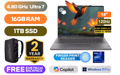 [TOUCHSCREEN] Lenovo Yoga 9 2-In-1 14IMH9 Intel® Core™ Ultra 7-155H up to 4.80GHz Processor, 24MB Cache, 16x Cores, 22x Threads / 16GB LPDDR5X RAM / 1TB Ultra-fast NVMe SSD / 14” 2.8K (2880x1800) 120Hz OLED Touchscreen Display / Intel Arc Integrated Graphics / <span style="color:r#00BFFF; font-size:18px;">Windows 11 Professional (64bit)</span> / 5MP IR Web Camera With Privacy Shutter / White Backlit Keyboard / Fingerprint Reader / Bluetooth 5.3 / Intel Wi-Fi 6E AX211 Wireless LAN / 1x USB Type-A / 1x USB Type-C with (USB PD 3.0 and DisplayPort™ 1.4) / 2x USB Type-C Thunderbolt™ 4 with (USB PD 3.0 and DisplayPort™ 1.4) / 1x Headphone and Microphone Combo Jack / Realtek ALC3306 Audio / Free Lenovo Slim Pen / Free USB-C 3-in-1 Hub / 2 Years Warranty / Lenovo Yoga 9 Intel® Core™ Ultra 7 Touchscreen 2-in-1 Laptop[TOUCHSCREEN] Lenovo Yoga 9 2-In-1 14IMH9 Intel® Core™ Ultra 7-155H up to 4.80GHz Processor, 24MB Cache, 16x Cores, 22x Threads / 16GB LPDDR5X RAM / 1TB Ultra-fast NVMe SSD / 14” 2.8K (2880x1800) 120Hz OLED Touchscreen Display / Intel Arc Integrated Graphics / Windows 11 Professional (64bit) / 5MP IR Web Camera With Privacy Shutter / White Backlit Keyboard / Fingerprint Reader / Bluetooth 5.3 / Intel Wi-Fi 6E AX211 Wireless LAN / 1x USB Type-A / 1x USB Type-C with (USB PD 3.0 and DisplayPort™ 1.4) / 2x USB Type-C Thunderbolt™ 4 with (USB PD 3.0 and DisplayPort™ 1.4) / 1x Headphone and Microphone Combo Jack / Realtek ALC3306 Audio / Free Lenovo Slim Pen / Free USB-C 3-in-1 Hub / 2 Years Warranty / Lenovo Yoga 9 Intel® Core™ Ultra 7 Touchscreen 2-in-1 Laptop [83AC0043SA-2YRS] / [+] GET FREE EVETECH NEO Premium Gaming Backpack+ FREE DELIVERY !