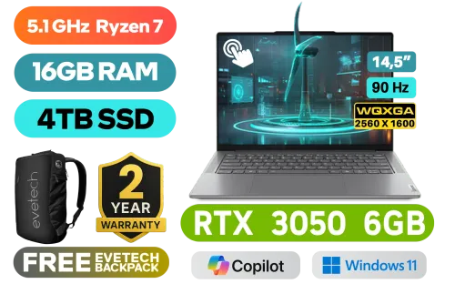[TOUCHSCREEN] Lenovo Yoga Pro 7 14AHP9 AMD Ryzen 7 8845HS up to 5.1GHz Processor, 24MB Cache, 8x Cores, 16x Threads / 16GB LPDDR5X RAM / 4TB Ultra-fast NVMe SSD / 14.5” WQXGA (2560 x 1600) 90Hz IPS-Level Touchscreen Display / Nvidia RTX 3050 6GB GDDR6 Dedicated Graphics / Windows 11 Home (64bit) / 1080p FHD IR Camera with E-Shutter / White Backlit Keyboard / RZ616 Wi-Fi 6E Wireless LAN / Bluetooth 5.3 / Realtek ALC3306 Audio / 1x USB Type-A / 2x USB Type-C (with USB PD 3.0 and DisplayPort™ 1.4) / 1x Headphone and Microphone Combo Jack / 1x HDMI / Lenovo Yoga Pro Mouse / 2 Years Warranty / Lenovo Yoga Pro 7 14AHP9 Ryzen 7 Laptop Deal[TOUCHSCREEN] Lenovo Yoga Pro 7 14AHP9 AMD Ryzen 7 8845HS up to 5.1GHz Processor, 24MB Cache, 8x Cores, 16x Threads / 16GB LPDDR5X RAM / 4TB Ultra-fast NVMe SSD / 14.5” WQXGA (2560 x 1600) 90Hz IPS-Level Touchscreen Display / Nvidia RTX 3050 6GB GDDR6 Dedicated Graphics / Windows 11 Home (64bit) / 1080p FHD IR Camera with E-Shutter / White Backlit Keyboard / RZ616 Wi-Fi 6E Wireless LAN / Bluetooth 5.3 / Realtek ALC3306 Audio / 1x USB Type-A / 2x USB Type-C (with USB PD 3.0 and DisplayPort™ 1.4) / 1x Headphone and Microphone Combo Jack / 1x HDMI / Lenovo Yoga Pro Mouse / 2 Years Warranty / Lenovo Yoga Pro 7 14AHP9 Ryzen 7 Laptop Deal [83E3002PSA/4TB] / [+] GET FREE EVETECH NEO Premium Gaming Backpack+ FREE DELIVERY !