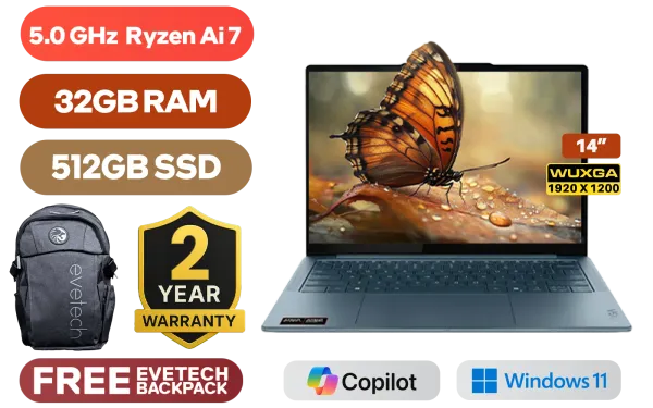 Lenovo Yoga Slim 7 14AKP10 AMD Ryzen AI 7-350 up to 5.0GHz Processor, 24MB Cache, 8x Cores, 16x Threads / 32GB LPDDR5x RAM / 512GB Ultra-fast NVMe SSD / 14” WUXGA (1920x1200) OLED Display / Integrated Radeon Graphics / Windows 11 Home (64bit) / RealTek WiFi 7 BE201 Wireless LAN / Bluetooth 5.4 / 1080p FHD IR Camera with E-Shutter / 1x USB Type-A / 2x USB Type-C (Supports DisplayPort 2.1 / Power Delivery) / 1x Headphone and Microphone Combo Jack / White Backlit Keyboard / 4 Stereo Speakers optimized with Dolby Atmos Audio / 2 Years Warranty / Lenovo Yoga Slim 7 14AKP10 Ryzen AI 7 Laptop DealLenovo Yoga Slim 7 14AKP10 AMD Ryzen AI 7-350 up to 5.0GHz Processor, 24MB Cache, 8x Cores, 16x Threads / 32GB LPDDR5x RAM / 512GB Ultra-fast NVMe SSD / 14” WUXGA (1920x1200) OLED Display / Integrated Radeon Graphics / Windows 11 Home (64bit) / RealTek WiFi 7 BE201 Wireless LAN / Bluetooth 5.4 / 1080p FHD IR Camera with E-Shutter / 1x USB Type-A / 2x USB Type-C (Supports DisplayPort 2.1 / Power Delivery) / 1x Headphone and Microphone Combo Jack / White Backlit Keyboard / 4 Stereo Speakers optimized with Dolby Atmos Audio / 2 Years Warranty / Lenovo Yoga Slim 7 14AKP10 Ryzen AI 7 Laptop Deal [83JY004ESA] / [+] GET FREE EVETECH FLUX Premium Gaming Backpack+ FREE DELIVERY !