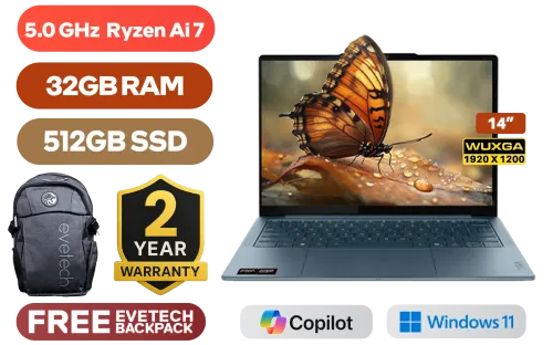 Lenovo Yoga Slim 7 14AKP10 AMD Ryzen AI 7-350 up to 5.0GHz Processor, 24MB Cache, 8x Cores, 16x Threads / 32GB LPDDR5x RAM / 512GB Ultra-fast NVMe SSD / 14” WUXGA (1920x1200) OLED Display / Integrated Radeon Graphics / Windows 11 Home (64bit) / RealTek WiFi 7 BE201 Wireless LAN / Bluetooth 5.4 / 1080p FHD IR Camera with E-Shutter / 1x USB Type-A / 2x USB Type-C (Supports DisplayPort 2.1 / Power Delivery) / 1x Headphone and Microphone Combo Jack / White Backlit Keyboard / 4 Stereo Speakers optimized with Dolby Atmos Audio / 2 Years Warranty / Lenovo Yoga Slim 7 14AKP10 Ryzen AI 7 Laptop DealLenovo Yoga Slim 7 14AKP10 AMD Ryzen AI 7-350 up to 5.0GHz Processor, 24MB Cache, 8x Cores, 16x Threads / 32GB LPDDR5x RAM / 512GB Ultra-fast NVMe SSD / 14” WUXGA (1920x1200) OLED Display / Integrated Radeon Graphics / Windows 11 Home (64bit) / RealTek WiFi 7 BE201 Wireless LAN / Bluetooth 5.4 / 1080p FHD IR Camera with E-Shutter / 1x USB Type-A / 2x USB Type-C (Supports DisplayPort 2.1 / Power Delivery) / 1x Headphone and Microphone Combo Jack / White Backlit Keyboard / 4 Stereo Speakers optimized with Dolby Atmos Audio / 2 Years Warranty / Lenovo Yoga Slim 7 14AKP10 Ryzen AI 7 Laptop Deal [83JY004ESA] / [+] GET FREE EVETECH FLUX Premium Gaming Backpack+ FREE DELIVERY !