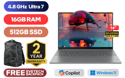 Lenovo Yoga Slim 7 14IMH9 Intel® Core™ Ultra 7-155H Up to 4.8GHz Processor, 24MB Cache, 16x Cores, 22x Threads / 16GB LPDDR5X RAM / 512GB Ultra-Fast NVME SSD / 14" WUXGA (1920 x 1200) OLED Display / Integrated Intel Arc Graphics / Windows 11 Home (64bit) / 1080P FHD Camera with E-Shutter / Intel Wi-Fi 6 AX203 Wireless LAN / Bluetooth 5.3 / Dolby Atmos® Audio / 1x USB Type-A / 2x USB Type-C (Thunderbolt™ 4 with USB PD 3.1 and DisplayPort™ 1.4) / 1x HDMI 2.1 / 1x Headphone Audio & Microphone Combo Jack / White Backlit keyboard / 2 Years Warranty / Lenovo Yoga Slim 7 Intel® Core™ Ultra 7 Laptop DealLenovo Yoga Slim 7 14IMH9 Intel® Core™ Ultra 7-155H Up to 4.8GHz Processor, 24MB Cache, 16x Cores, 22x Threads / 16GB LPDDR5X RAM / 512GB Ultra-Fast NVME SSD / 14" WUXGA (1920 x 1200) OLED Display / Integrated Intel Arc Graphics / Windows 11 Home (64bit) / 1080P FHD Camera with E-Shutter / Intel Wi-Fi 6 AX203 Wireless LAN / Bluetooth 5.3 / Dolby Atmos® Audio / 1x USB Type-A / 2x USB Type-C (Thunderbolt™ 4 with USB PD 3.1 and DisplayPort™ 1.4) / 1x HDMI 2.1 / 1x Headphone Audio & Microphone Combo Jack / White Backlit keyboard / 2 Years Warranty / Lenovo Yoga Slim 7 Intel® Core™ Ultra 7 Laptop Deal [83CV007RSA] / [+] GET FREE EVETECH DASH Premium Gaming Backpack+ FREE DELIVERY !