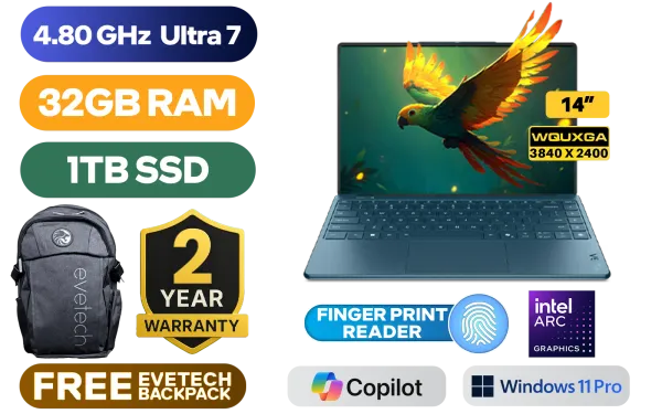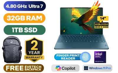 [TOUCHSCREEN] Lenovo Yoga Slim 9 14ILL10 Intel Core Ultra 7 258V up to 4.80GHz Processor, 12MB Cache, 8x Cores, 8x Threads / 32GB Memory / 1TB Ultra-fast NVMe SSD / 14” 4K WQUXGA (3840x2400) OLED Display / Integrated Intel® Arc™ 140V Graphics / <span style="font-size: 20px; color: #00BFFF; font-weight: bold;">Windows 11 Professional (64bit)</span> / FHD 1080p Web Camera with E-shutter / White Backlit Keyboard / Fingerprint Reader / Bluetooth 5.4 / Wi-Fi 7 BE201 Wireless LAN / 4x Dolby Atmos™ speaker system / 2 x USB Type-C (Thunderbolt™ 4 / USB4® 40Gbps), with USB PD 3.0 and DisplayPort™ 2.1) / FREE Lenovo USB Type-C Adapter + Lenovo Yoga Sleeve + Lenovo TWS Yoga Wireless Ear Buds / 2 Year Warranty / Lenovo Yoga Slim 9 Ultra 7 Touchscreen Laptop Deal[TOUCHSCREEN] Lenovo Yoga Slim 9 14ILL10 Intel Core Ultra 7 258V up to 4.80GHz Processor, 12MB Cache, 8x Cores, 8x Threads / 32GB Memory / 1TB Ultra-fast NVMe SSD / 14” 4K WQUXGA (3840x2400) OLED Display / Integrated Intel® Arc™ 140V Graphics / Windows 11 Professional (64bit) / FHD 1080p Web Camera with E-shutter / White Backlit Keyboard / Fingerprint Reader / Bluetooth 5.4 / Wi-Fi 7 BE201 Wireless LAN / 4x Dolby Atmos™ speaker system / 2 x USB Type-C (Thunderbolt™ 4 / USB4® 40Gbps), with USB PD 3.0 and DisplayPort™ 2.1) / FREE Lenovo USB Type-C Adapter + Lenovo Yoga Sleeve + Lenovo TWS Yoga Wireless Ear Buds / 2 Year Warranty / Lenovo Yoga Slim 9 Ultra 7 Touchscreen Laptop Deal [83CX0022SA] / [+] GET FREE EVETECH FLUX Premium Gaming Backpack+ FREE DELIVERY !
