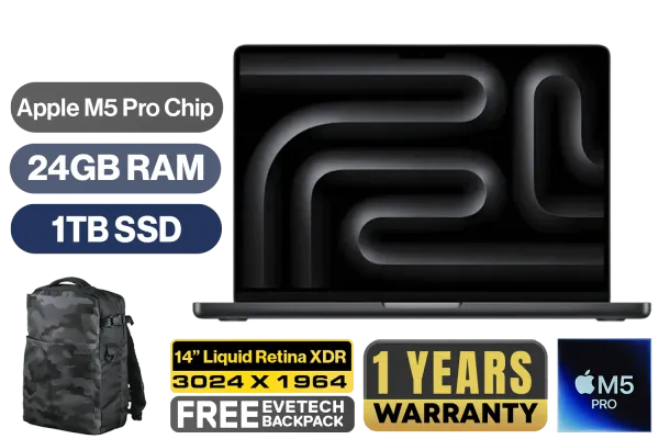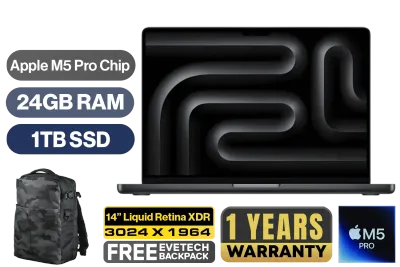 MacBook Pro 14" Apple M5 Pro Chip with 15-Core CPU (5 Super Cores + 10 Performance Cores), 16-Core Neural Engine / 16-Core GPU with Neural Accelerators & Hardware-Accelerated Ray Tracing / 24GB Unified RAM / 1TB Ultra-Fast SSD / 14.2" Liquid Retina XDR (3024 x 1964) IPS Display / macOS with Apple Intelligence / 12MP Center Stage Camera with Desk View / Apple Wi-Fi 6E Wireless Chip / Bluetooth 5.3 / 3x USB Type-C (Thunderbolt 5) / 1x MagSafe 3 Charging Port [Charging Block not included] / 1x Microphone & Headphone Combo Jack / 1x HDMI / 1x SDXC Slot / 6-Speaker Sound System with Spatial Audio & Dolby Atmos / Touch ID / Backlit Magic Keyboard / 1-Year Warranty / MacBook Pro 14" M5 Pro (1TB) - Space Black [MGDR4ZE/A] + FREE DELIVERY !