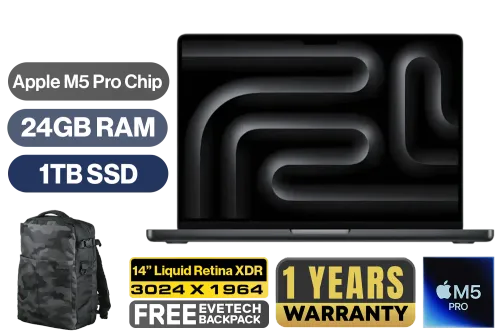 MacBook Pro 14" Apple M5 Pro Chip with 15-Core CPU (5 Super Cores + 10 Performance Cores), 16-Core Neural Engine / 16-Core GPU with Neural Accelerators & Hardware-Accelerated Ray Tracing / 24GB Unified RAM / 1TB Ultra-Fast SSD / 14.2" Liquid Retina XDR (3024 x 1964) IPS Display / macOS with Apple Intelligence / 12MP Center Stage Camera with Desk View / Apple Wi-Fi 6E Wireless Chip / Bluetooth 5.3 / 3x USB Type-C (Thunderbolt 5) / 1x MagSafe 3 Charging Port [Charging Block not included] / 1x Microphone & Headphone Combo Jack / 1x HDMI / 1x SDXC Slot / 6-Speaker Sound System with Spatial Audio & Dolby Atmos / Touch ID / Backlit Magic Keyboard / 1-Year Warranty / MacBook Pro 14" M5 Pro (1TB) - Space Black