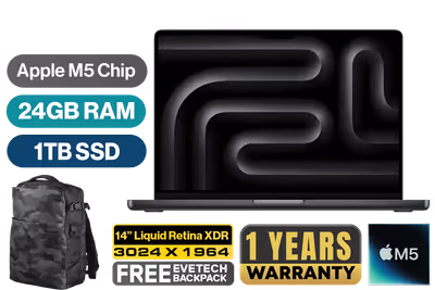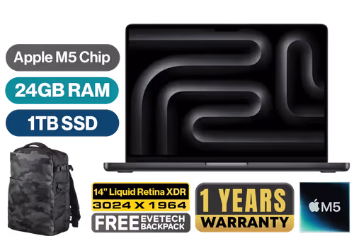 MacBook Pro 14" Apple M5 Chip with 10-Core CPU (4 Super Cores + 6 Efficiency Cores), 16-Core Neural Engine / 10-Core GPU with Neural Accelerators & Hardware-Accelerated Ray Tracing / 24GB Unified RAM / 1TB Ultra-Fast SSD / 14.2" Liquid Retina XDR (3024 x 1964) IPS Display / macOS with Apple Intelligence / 12MP Center Stage Camera with Desk View / Apple Wi-Fi 6E Wireless Chip / Bluetooth 5.3 / 3x USB Type-C (Thunderbolt 5) / 1x MagSafe 3 Charging Port [Charging Block not included] / 1x Microphone & Headphone Combo Jack / 1x HDMI / 1x SDXC Slot / 6-Speaker Sound System with Spatial Audio & Dolby Atmos / Touch ID / Backlit Magic Keyboard / 1-Year Warranty / MacBook Pro 14" M5 (1TB) - Space Black [MDE34ZE/A] / [+] GET FREE EVETECH DASH Premium Gaming Backpack+ FREE DELIVERY !