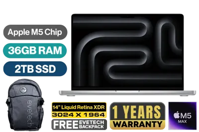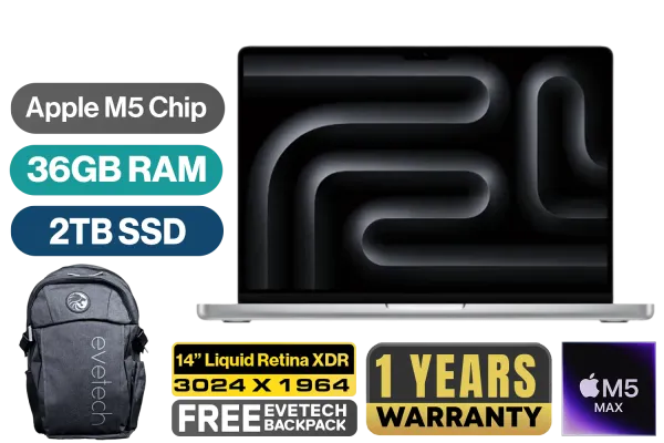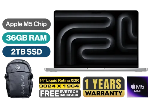 MacBook Pro 14" Apple M5 Max Chip with 18-Core CPU (6 Super Cores + 12 Performance Cores), 16-Core Neural Engine / 32-Core GPU with Neural Accelerators & Hardware-Accelerated Ray Tracing / 36GB Unified RAM / 2TB Ultra-Fast SSD / 14.2" Liquid Retina XDR (3024 x 1964) IPS Display / macOS with Apple Intelligence / 12MP Center Stage Camera with Desk View / Apple Wi-Fi 6E Wireless Chip / Bluetooth 5.3 / 3x USB Type-C (Thunderbolt 5) / 1x MagSafe 3 Charging Port [Charging Block not included] / 1x Microphone & Headphone Combo Jack / 1x HDMI / 1x SDXC Slot / 6-Speaker Sound System with Spatial Audio & Dolby Atmos / Touch ID / Backlit Magic Keyboard / 1-Year Warranty / MacBook Pro 14" M5 Max (2TB) - Silver [MGDQ4ZE/A] / [+] GET FREE EVETECH FLUX Premium Gaming Backpack+ FREE DELIVERY !