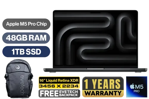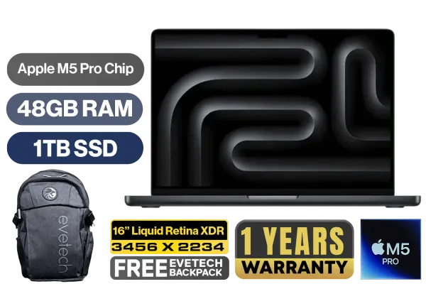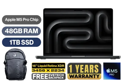 MacBook Pro 16" Apple M5 Pro Chip with 18-Core CPU (6 Super Cores + 12 Performance Cores), 16-Core Neural Engine / 20-Core GPU with Neural Accelerators & Hardware-Accelerated Ray Tracing / 48GB Unified RAM / 1TB Ultra-Fast SSD / 16.2" Liquid Retina XDR (3456 x 2234) IPS Display / macOS with Apple Intelligence / 12MP Center Stage Camera with Desk View / Apple N1 Wi-Fi 7 Wireless Chip / Bluetooth 6 / 3x USB Type-C (Thunderbolt 5) / 1x MagSafe 3 Charging Port [Charging Block not included] / 1x Microphone & Headphone Combo Jack / 1x HDMI / 1x SDXC Slot / 6-Speaker Sound System with Spatial Audio & Dolby Atmos / Touch ID / Backlit Magic Keyboard / 1-Year Warranty / MacBook Pro 16" M5 Pro (1TB) - Space Black [MGEC4ZE/A] / [+] GET FREE EVETECH FLUX Premium Gaming Backpack+ FREE DELIVERY !