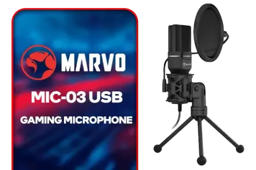 MARVO MIC-03 USB Gaming Microphone / Omnidirectional Microphone / Professional 3D Stereo Live Sound / Foldable Metal Tripod For Desktop / Adjustable Stand Angle / Plug & Play Easy Connect / 1.5m Cable Length / USB Connectors / MIC-03 / MARVO MIC-03
