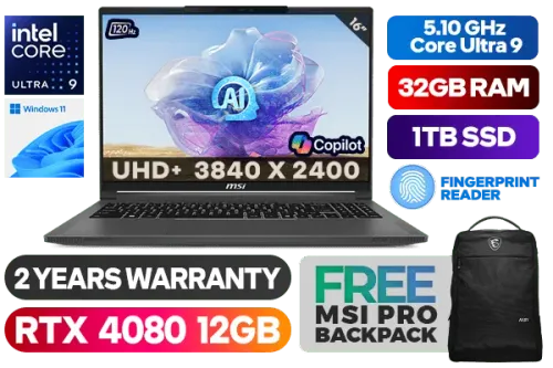 MSI Creator 16 AI Studio A1VHG Ultra 9-185H up to 5.10GHz Processor, 24MB Cache, 16x Cores, 22x Threads / 32GB DDR5 RAM / 1TB Ultra-Fast NVME SSD / 16" UHD+ (3840 x 2400) MiniLED 120Hz Display / NVIDIA 40 Series GeForce RTX 4080 12GB GDDR6 Dedicated Graphics / Windows 11 Home (64bit) / White Single Backlit Keyboard / IR FHD type (30fps@1080p) / Bluetooth 5.4 / Intel® Killer™ BE Wi-Fi 7 Wireless LAN / 1 x Mic-in/Headphone-out Combo Jack / 1x USB3.2 Type-C (DP) / 1x USB Type-C (Thunderbolt 4, DP) with PD charging / 1x USB 3.2 Type-A / 1 x HDMI / 1 x Micro SD Card Reader / Nahimic Next Level Audio / Fingerprint Reader / 2 Years Warranty / Free MSI Backpack / MSI Creator 16 AI Studio A1V Core Ultra 9 RTX 4080 Gaming Laptop DealMSI Creator 16 AI Studio A1VHG Ultra 9-185H up to 5.10GHz Processor, 24MB Cache, 16x Cores, 22x Threads / 32GB DDR5 RAM / 1TB Ultra-Fast NVME SSD / 16" UHD+ (3840 x 2400) MiniLED 120Hz Display / NVIDIA 40 Series GeForce RTX 4080 12GB GDDR6 Dedicated Graphics / Windows 11 Home (64bit) / White Single Backlit Keyboard / IR FHD type (30fps@1080p) / Bluetooth 5.4 / Intel® Killer™ BE Wi-Fi 7 Wireless LAN / 1 x Mic-in/Headphone-out Combo Jack / 1x USB3.2 Type-C (DP) / 1x USB Type-C (Thunderbolt 4, DP) with PD charging / 1x USB 3.2 Type-A / 1 x HDMI / 1 x Micro SD Card Reader / Nahimic Next Level Audio / Fingerprint Reader / 2 Years Warranty / Free MSI Backpack / MSI Creator 16 AI Studio A1V Core Ultra 9 RTX 4080 Gaming Laptop Deal [Creator-16-AI-Studio-A1VHG-045ZA] + FREE DELIVERY !