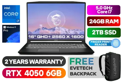 MSI Creator M16 B13VE 13th Gen Intel® Core™ i7-13700H up to 5.0GHz Processor, 24MB Cache, 14x Cores, 20x Threads / 24GB DDR5 RAM / 2TB Ultra-Fast NVMe SSD / 16" QHD+ (2560 x 1600) IPS-Level Display / NVIDIA GeForce RTX 4050 6GB GDDR6 Dedicated Graphics / <span style="font-size: 20px; color: #00BFFF; font-weight: bold;">Windows 11 Professional (64bit)</span> / Intel Wi-Fi 6 Wireless LAN / Bluetooth 5.2 / Single-Color White Backlight Keyboard / HD Webcam (30fps@720p) / 3x USB Type-A / 1x USB Type-C / 1x HDMI / 1x Headphone Audio & Microphone Combo Jack / Finger Print Reader / Nahimic Hi-Res Audio Technology / 2 Year MSI Warranty / MSI Creator M16 B13VE Core i7 RTX 4050 Professional LaptopMSI Creator M16 B13VE 13th Gen Intel® Core™ i7-13700H up to 5.0GHz Processor, 24MB Cache, 14x Cores, 20x Threads / 24GB DDR5 RAM / 2TB Ultra-Fast NVMe SSD / 16" QHD+ (2560 x 1600) IPS-Level Display / NVIDIA GeForce RTX 4050 6GB GDDR6 Dedicated Graphics / Windows 11 Professional (64bit) / Intel Wi-Fi 6 Wireless LAN / Bluetooth 5.2 / Single-Color White Backlight Keyboard / HD Webcam (30fps@720p) / 3x USB Type-A / 1x USB Type-C / 1x HDMI / 1x Headphone Audio & Microphone Combo Jack / Finger Print Reader / Nahimic Hi-Res Audio Technology / 2 Year MSI Warranty / MSI Creator M16 B13VE Core i7 RTX 4050 Professional Laptop [CREATOR-M16-B13VE-1460ZA/24GB/2TB] / [+] GET FREE EVETECH NEO Premium Gaming Backpack+ FREE DELIVERY !