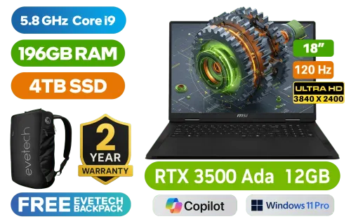 MSI Creator Pro X18 HX A14VKSG Intel® Core™ i9-14900HX up to 5.8GHz Processor, 36MB Cache, 24x Cores, 32x Threads / 192GB DDR5 RAM / 4TB Ultra-Fast NVMe SSD / 18" UHD+ (3840x2400) 120Hz, IPS-Level Display / NVIDIA GeForce RTX 3500 Ada Generation 12GB GDDR6 Dedicated Graphics / <span style="font-size: 20px; color: #00BFFF; font-weight: bold;">Windows 11 Professional (64bit)</span> / Intel Killer WiFi 7 BE1750x Wireless LAN / Bluetooth 5.4 / 1080p FHD Camera / 3 x USB Type-A / 2 x USB Type-C (Supports Thunderbolt 4 / DisplayPort™/ Power Delivery 3.1) / 1 x HDMI / 1x RJ45 / 1x Headphone & Microphone Combo Jack / 1x SD Express Card Reader / 4x 2W Speakers / White Backlit Keyboard / Free MSI Lucky Keychain / Free MSI Bluetooth Mouse / 2 Years Warranty / MSI Creator Pro X18 HX A14VKSG Core i9 RTX 3500 Ada LaptopMSI Creator Pro X18 HX A14VKSG Intel® Core™ i9-14900HX up to 5.8GHz Processor, 36MB Cache, 24x Cores, 32x Threads / 192GB DDR5 RAM / 4TB Ultra-Fast NVMe SSD / 18" UHD+ (3840x2400) 120Hz, IPS-Level Display / NVIDIA GeForce RTX 3500 Ada Generation 12GB GDDR6 Dedicated Graphics / Windows 11 Professional (64bit) / Intel Killer WiFi 7 BE1750x Wireless LAN / Bluetooth 5.4 / 1080p FHD Camera / 3 x USB Type-A / 2 x USB Type-C (Supports Thunderbolt 4 / DisplayPort™/ Power Delivery 3.1) / 1 x HDMI / 1x RJ45 / 1x Headphone & Microphone Combo Jack / 1x SD Express Card Reader / 4x 2W Speakers / White Backlit Keyboard / Free MSI Lucky Keychain / Free MSI Bluetooth Mouse / 2 Years Warranty / MSI Creator Pro X18 HX A14VKSG Core i9 RTX 3500 Ada Laptop [MSI-CREATORPRO-X18-HX-A14VKSG-627ZA/192GB] / [+] GET FREE EVETECH NEO Premium Gaming Backpack+ FREE DELIVERY !