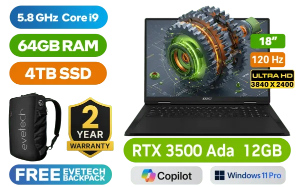 MSI Creator Pro X18 HX A14VKSG Intel® Core™ i9-14900HX up to 5.8GHz Processor, 36MB Cache, 24x Cores, 32x Threads / 64GB DDR5 RAM / 4TB Ultra-Fast NVMe SSD / 18" UHD+ (3840x2400) 120Hz, IPS-Level Display / NVIDIA GeForce RTX 3500 Ada Generation 12GB GDDR6 Dedicated Graphics / <span style="font-size: 20px; color: #00BFFF; font-weight: bold;">Windows 11 Professional (64bit)</span> / Intel Killer WiFi 7 BE1750x Wireless LAN / Bluetooth 5.4 / 1080p FHD Camera / 3 x USB Type-A / 2 x USB Type-C (Supports Thunderbolt 4 / DisplayPort™/ Power Delivery 3.1) / 1 x HDMI / 1x RJ45 / 1x Headphone & Microphone Combo Jack / 1x SD Express Card Reader / 4x 2W Speakers / White Backlit Keyboard / Free MSI Lucky Keychain / Free MSI Bluetooth Mouse / 2 Years Warranty / MSI Creator Pro X18 HX A14VKSG Core i9 RTX 3500 Ada LaptopMSI Creator Pro X18 HX A14VKSG Intel® Core™ i9-14900HX up to 5.8GHz Processor, 36MB Cache, 24x Cores, 32x Threads / 64GB DDR5 RAM / 4TB Ultra-Fast NVMe SSD / 18" UHD+ (3840x2400) 120Hz, IPS-Level Display / NVIDIA GeForce RTX 3500 Ada Generation 12GB GDDR6 Dedicated Graphics / Windows 11 Professional (64bit) / Intel Killer WiFi 7 BE1750x Wireless LAN / Bluetooth 5.4 / 1080p FHD Camera / 3 x USB Type-A / 2 x USB Type-C (Supports Thunderbolt 4 / DisplayPort™/ Power Delivery 3.1) / 1 x HDMI / 1x RJ45 / 1x Headphone & Microphone Combo Jack / 1x SD Express Card Reader / 4x 2W Speakers / White Backlit Keyboard / Free MSI Lucky Keychain / Free MSI Bluetooth Mouse / 2 Years Warranty / MSI Creator Pro X18 HX A14VKSG Core i9 RTX 3500 Ada Laptop [MSI-CREATORPRO-X18-HX-A14VKSG-627ZA] / [+] GET FREE EVETECH NEO Premium Gaming Backpack+ FREE DELIVERY !