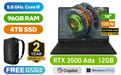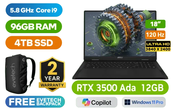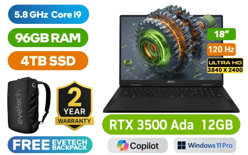 MSI Creator Pro X18 HX A14VKSG Intel® Core™ i9-14900HX up to 5.8GHz Processor, 36MB Cache, 24x Cores, 32x Threads / 96GB DDR5 RAM / 4TB Ultra-Fast NVMe SSD / 18" UHD+ (3840x2400) 120Hz, IPS-Level Display / NVIDIA GeForce RTX 3500 Ada Generation 12GB GDDR6 Dedicated Graphics / <span style="font-size: 20px; color: #00BFFF; font-weight: bold;">Windows 11 Professional (64bit)</span> / Intel Killer WiFi 7 BE1750x Wireless LAN / Bluetooth 5.4 / 1080p FHD Camera / 3 x USB Type-A / 2 x USB Type-C (Supports Thunderbolt 4 / DisplayPort™/ Power Delivery 3.1) / 1 x HDMI / 1x RJ45 / 1x Headphone & Microphone Combo Jack / 1x SD Express Card Reader / 4x 2W Speakers / White Backlit Keyboard / Free MSI Lucky Keychain / Free MSI Bluetooth Mouse / 2 Years Warranty / MSI Creator Pro X18 HX A14VKSG Core i9 RTX 3500 Ada LaptopMSI Creator Pro X18 HX A14VKSG Intel® Core™ i9-14900HX up to 5.8GHz Processor, 36MB Cache, 24x Cores, 32x Threads / 96GB DDR5 RAM / 4TB Ultra-Fast NVMe SSD / 18" UHD+ (3840x2400) 120Hz, IPS-Level Display / NVIDIA GeForce RTX 3500 Ada Generation 12GB GDDR6 Dedicated Graphics / Windows 11 Professional (64bit) / Intel Killer WiFi 7 BE1750x Wireless LAN / Bluetooth 5.4 / 1080p FHD Camera / 3 x USB Type-A / 2 x USB Type-C (Supports Thunderbolt 4 / DisplayPort™/ Power Delivery 3.1) / 1 x HDMI / 1x RJ45 / 1x Headphone & Microphone Combo Jack / 1x SD Express Card Reader / 4x 2W Speakers / White Backlit Keyboard / Free MSI Lucky Keychain / Free MSI Bluetooth Mouse / 2 Years Warranty / MSI Creator Pro X18 HX A14VKSG Core i9 RTX 3500 Ada Laptop [MSI-CREATORPRO-X18-HX-A14VKSG-627ZA/96GB] / [+] GET FREE EVETECH NEO Premium Gaming Backpack+ FREE DELIVERY !