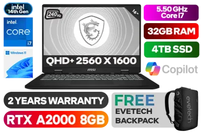 MSI CreatorPro M16 C14VJG 14th Gen Intel Core i7-14700HX up to 5.50GHz Processor, 33MB Cache, 20x Cores, 28x Threads / 32GB DDR5 RAM / 4TB Ultra-Fast NVMe SSD / 16" QHD+ (2560 x 1600) 240Hz Ani-Glare IPS Level Display / NVIDIA RTX 2000 ADA Generation 8GB GDDR6 Dedicated Workstation Graphics Card / Windows 11 Home (64bit) / HD 720p Web Camera / Intel AX211 Wi-Fi 6E Wireless LAN / Bluetooth v5.3 / 3x USB Type-A / 1x USB Type-C / 1x HDMI / 1x RJ45 / 1x Microphone and Headphone Combo Jack / Full-size White Backlight Keyboard / 2x 2W Speaker / 2 Year Warranty / MSI CreatorPro M16 RTX A2000 Core i7 Workstation LaptopMSI CreatorPro M16 C14VJG 14th Gen Intel Core i7-14700HX up to 5.50GHz Processor, 33MB Cache, 20x Cores, 28x Threads / 32GB DDR5 RAM / 4TB Ultra-Fast NVMe SSD / 16" QHD+ (2560 x 1600) 240Hz Ani-Glare IPS Level Display / NVIDIA RTX 2000 ADA Generation 8GB GDDR6 Dedicated Workstation Graphics Card / Windows 11 Home (64bit) / HD 720p Web Camera / Intel AX211 Wi-Fi 6E Wireless LAN / Bluetooth v5.3 / 3x USB Type-A / 1x USB Type-C / 1x HDMI / 1x RJ45 / 1x Microphone and Headphone Combo Jack / Full-size White Backlight Keyboard / 2x 2W Speaker / 2 Year Warranty / MSI CreatorPro M16 RTX A2000 Core i7 Workstation Laptop [CREATORPRO-M16 HX C14VJG-476ZA/32GB/4TB] / [+] GET FREE EVETECH NEO Premium Gaming Backpack+ FREE DELIVERY !
