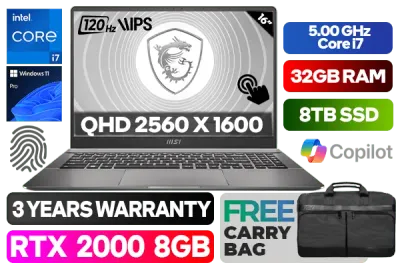 [TOUCHSCREEN] MSI CreatorPro Z16 HX Studio B13VJTO 13th Gen Intel Core i7-13700HX up to 5.00GHz Processor, 30MB Cache, 16x Cores, 24x Threads / 32GB DDR5 RAM / 8TB Ultra-Fast NVMe SSD / 16" QHD+ (2560 x 1600) 120Hz IPS Touchscreen Display / NVIDIA RTX 2000 Ada Generation 8GB GDDR6 Dedicated Workstation Graphics Card / <span style="font-size: 20px; color: #00BFFF; font-weight: bold;">Windows 11 Professional (64bit)</span> / HD IR Camera / Wi-Fi 6E Wireless LAN / Bluetooth v5.3 / 1x USB 3.2 Type-A / 1x USB Type-C Thunderbolt support DisplayPort / 1x HDMI 2.1 / 1 x Audio And Microphone Combo Jack / Fingerprint Reader / 1x SD Card Reader / Full-size Per-Key RGB Keyboard / Sound by Dynaudio / FREE MSI Carry Bag / MSI CreatorPro Z16 B13VJTO RTX 2000 Workstation Laptop Deal[TOUCHSCREEN] MSI CreatorPro Z16 HX Studio B13VJTO 13th Gen Intel Core i7-13700HX up to 5.00GHz Processor, 30MB Cache, 16x Cores, 24x Threads / 32GB DDR5 RAM / 8TB Ultra-Fast NVMe SSD / 16" QHD+ (2560 x 1600) 120Hz IPS Touchscreen Display / NVIDIA RTX 2000 Ada Generation 8GB GDDR6 Dedicated Workstation Graphics Card / Windows 11 Professional (64bit) / HD IR Camera / Wi-Fi 6E Wireless LAN / Bluetooth v5.3 / 1x USB 3.2 Type-A / 1x USB Type-C Thunderbolt support DisplayPort / 1x HDMI 2.1 / 1 x Audio And Microphone Combo Jack / Fingerprint Reader / 1x SD Card Reader / Full-size Per-Key RGB Keyboard / Sound by Dynaudio / FREE MSI Carry Bag / MSI CreatorPro Z16 B13VJTO RTX 2000 Workstation Laptop Deal [MSI-CREATORPRO-Z16HXSTUDIO-B13VJTO-218ZA/8TB] / 3 YEARS WARRANTY + FREE DELIVERY !