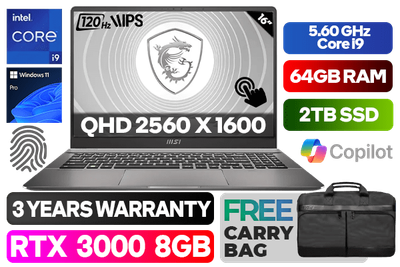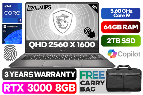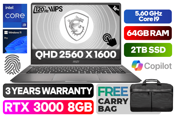 [<span style="color:red; font-size:18px;">TOUCHSCREEN</span>] MSI CreatorPro Z16 HX Studio B13VKTO 13th Gen Intel Core i9-13980HX up to 5.60GHz Processor, 36MB Cache, 24x Cores, 32x Threads / 64GB DDR5 RAM / 2TB Ultra-Fast NVMe SSD / 16" QHD+ (2560 x 1600) 120Hz IPS Touchscreen Display / NVIDIA RTX 3000 ADA Generation 8GB GDDR6 Dedicated Workstation Graphics Card / <span style="color:blue; font-size:18px;">Windows 11 Professional (64bit)</span> / HD IR Camera / Wi-Fi 6E Wireless LAN / Bluetooth v5.3 / 1x USB 3.2 Type-A / 1x USB Type-C Thunderbolt support DisplayPort / 1x HDMI 2.1 / 1 x Audio And Microphone Combo Jack / Fingerprint Reader / 1x SD Card Reader / Full-size Per-Key <span style="font-size: 20px; color: rgb(255, 0, 0);">R</span><span style="font-size: 20px; color: rgb(51, 102, 255);">B</span><span style="font-size: 20px; color: rgb(51, 153, 0);">G</span> Keyboard / Sound by Dynaudio / FREE MSI Carry Bag / MSI CreatorPro Z16 B13VKTO RTX 3000 Workstation Laptop Deal[TOUCHSCREEN] MSI CreatorPro Z16 HX Studio B13VKTO 13th Gen Intel Core i9-13980HX up to 5.60GHz Processor, 36MB Cache, 24x Cores, 32x Threads / 64GB DDR5 RAM / 2TB Ultra-Fast NVMe SSD / 16" QHD+ (2560 x 1600) 120Hz IPS Touchscreen Display / NVIDIA RTX 3000 ADA Generation 8GB GDDR6 Dedicated Workstation Graphics Card / Windows 11 Professional (64bit) / HD IR Camera / Wi-Fi 6E Wireless LAN / Bluetooth v5.3 / 1x USB 3.2 Type-A / 1x USB Type-C Thunderbolt support DisplayPort / 1x HDMI 2.1 / 1 x Audio And Microphone Combo Jack / Fingerprint Reader / 1x SD Card Reader / Full-size Per-Key RBG Keyboard / Sound by Dynaudio / FREE MSI Carry Bag / MSI CreatorPro Z16 B13VKTO RTX 3000 Workstation Laptop Deal [MSI-CREATORPRO-Z16HXSTUDIO-B13VKTO-217ZA] / 3 YEARS WARRANTY + FREE DELIVERY !