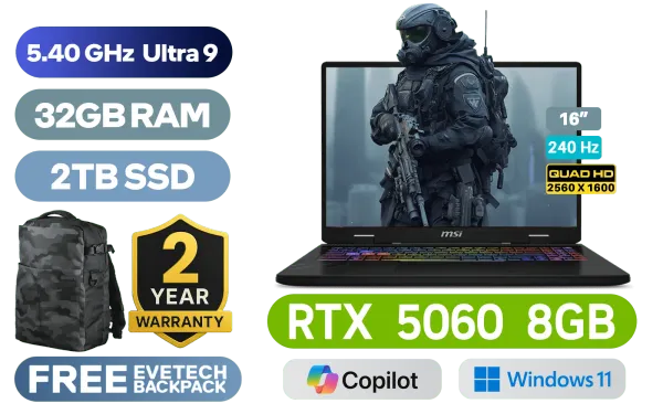 MSI Crosshair 16 HX AI D2XWFKG Intel® Core™ Ultra 9-275HX up to 5.40GHz Processor, 76MB Cache, 24x Cores, 24x Threads / 32GB DDR5 RAM / 2TB Ultra-Fast NVMe SSD / 16" QHD+ (2560x1600) 240Hz, IPS-Level Display / NVIDIA GeForce RTX 5060 8GB GDDR7 Dedicated Graphics / Windows 11 Home (64bit) / Intel Wi-Fi 6E AX211 Wireless LAN / Bluetooth 5.3 / 720p HD Web Camera / 3 x USB Type-A / 1 x USB Type-C (DisplayPort™/ Power Delivery 3.0) / 1 x HDMI / RJ-45 / 1x Headphone and Microphone Combo Jack / Nahimic Audio by Steelseries / RGB Backlit Keyboard / 2 Years MSI Warranty / MSI Crosshair 16 HX AI D2XWFKG Intel® Core™ Ultra 9 RTX 5060 Gaming LaptopMSI Crosshair 16 HX AI D2XWFKG Intel® Core™ Ultra 9-275HX up to 5.40GHz Processor, 76MB Cache, 24x Cores, 24x Threads / 32GB DDR5 RAM / 2TB Ultra-Fast NVMe SSD / 16" QHD+ (2560x1600) 240Hz, IPS-Level Display / NVIDIA GeForce RTX 5060 8GB GDDR7 Dedicated Graphics / Windows 11 Home (64bit) / Intel Wi-Fi 6E AX211 Wireless LAN / Bluetooth 5.3 / 720p HD Web Camera / 3 x USB Type-A / 1 x USB Type-C (DisplayPort™/ Power Delivery 3.0) / 1 x HDMI / RJ-45 / 1x Headphone and Microphone Combo Jack / Nahimic Audio by Steelseries / RGB Backlit Keyboard / 2 Years MSI Warranty / MSI Crosshair 16 HX AI D2XWFKG Intel® Core™ Ultra 9 RTX 5060 Gaming Laptop [Crosshair-16-HX-AI-D2XWFKG-230ZA/32GB/2TB] / [+] GET FREE EVETECH DASH Premium Gaming Backpack+ FREE DELIVERY !