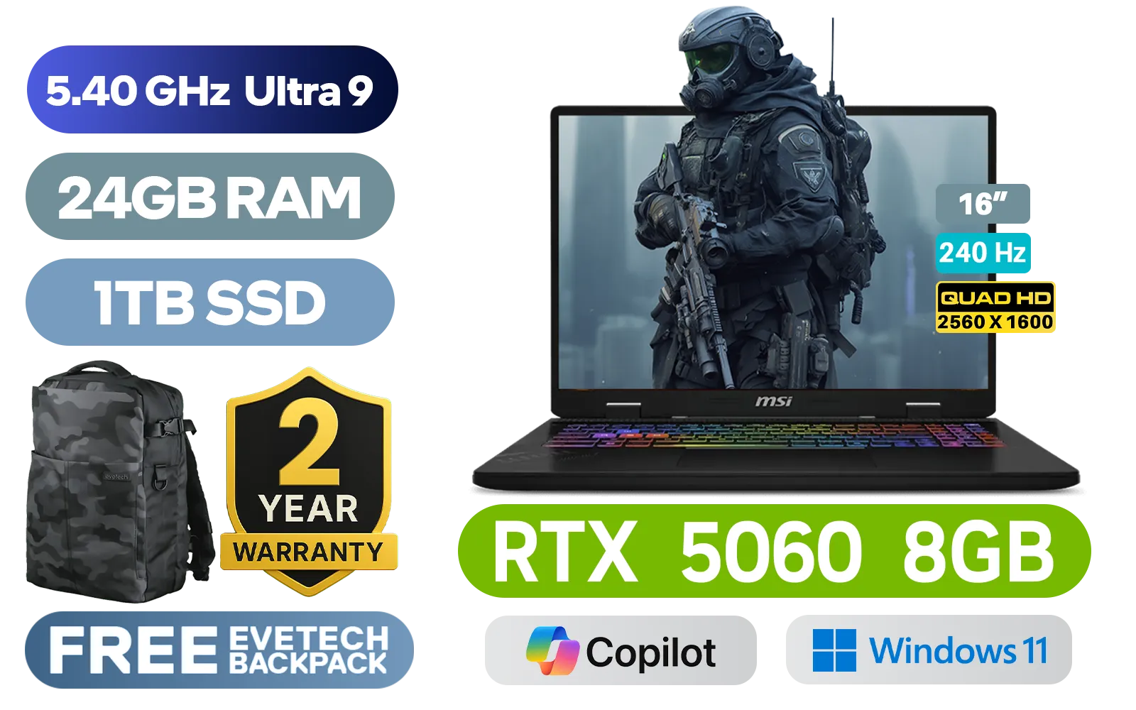 MSI Crosshair 16 HX AI D2XWFKG Intel® Core™ Ultra 9-275HX up to 5.40GHz Processor, 76MB Cache, 24x Cores, 24x Threads / 24GB DDR5 RAM / 1TB Ultra-Fast NVMe SSD / 16" QHD+ (2560x1600) 240Hz, IPS-Level Display / NVIDIA GeForce RTX 5060 8GB GDDR7 Dedicated Graphics / Windows 11 Home (64bit) / Intel Wi-Fi 6E AX211 Wireless LAN / Bluetooth 5.3 / 720p HD Web Camera / 3 x USB Type-A / 1 x USB Type-C (DisplayPort™/ Power Delivery 3.0) / 1 x HDMI / RJ-45 / 1x Headphone and Microphone Combo Jack / Nahimic Audio by Steelseries / RGB Backlit Keyboard / 2 Years MSI Warranty / MSI Crosshair 16 HX AI D2XWFKG Intel® Core™ Ultra 9 RTX 5060 Gaming LaptopMSI Crosshair 16 HX AI D2XWFKG Intel® Core™ Ultra 9-275HX up to 5.40GHz Processor, 76MB Cache, 24x Cores, 24x Threads / 24GB DDR5 RAM / 1TB Ultra-Fast NVMe SSD / 16" QHD+ (2560x1600) 240Hz, IPS-Level Display / NVIDIA GeForce RTX 5060 8GB GDDR7 Dedicated Graphics / Windows 11 Home (64bit) / Intel Wi-Fi 6E AX211 Wireless LAN / Bluetooth 5.3 / 720p HD Web Camera / 3 x USB Type-A / 1 x USB Type-C (DisplayPort™/ Power Delivery 3.0) / 1 x HDMI / RJ-45 / 1x Headphone and Microphone Combo Jack / Nahimic Audio by Steelseries / RGB Backlit Keyboard / 2 Years MSI Warranty / MSI Crosshair 16 HX AI D2XWFKG Intel® Core™ Ultra 9 RTX 5060 Gaming Laptop [Crosshair-16-HX-AI-D2XWFKG-230ZA/24GB] / [+] GET FREE EVETECH DASH Premium Gaming Backpack+ FREE DELIVERY !