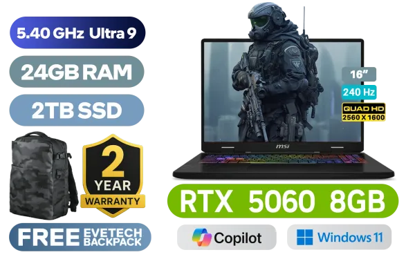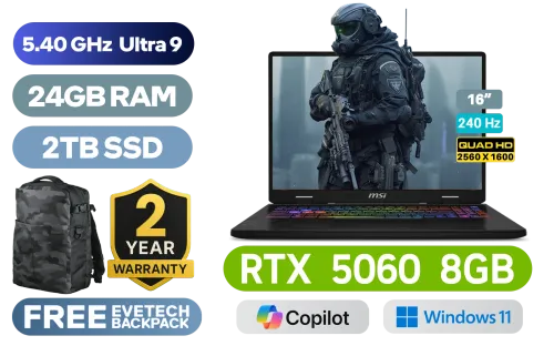 MSI Crosshair 16 HX AI D2XWFKG Intel® Core™ Ultra 9-275HX up to 5.40GHz Processor, 76MB Cache, 24x Cores, 24x Threads / 24GB DDR5 RAM / 2TB Ultra-Fast NVMe SSD / 16" QHD+ (2560x1600) 240Hz, IPS-Level Display / NVIDIA GeForce RTX 5060 8GB GDDR7 Dedicated Graphics / Windows 11 Home (64bit) / Intel Wi-Fi 6E AX211 Wireless LAN / Bluetooth 5.3 / 720p HD Web Camera / 3 x USB Type-A / 1 x USB Type-C (DisplayPort™/ Power Delivery 3.0) / 1 x HDMI / RJ-45 / 1x Headphone and Microphone Combo Jack / Nahimic Audio by Steelseries / RGB Backlit Keyboard / 2 Years MSI Warranty / MSI Crosshair 16 HX AI D2XWFKG Intel® Core™ Ultra 9 RTX 5060 Gaming LaptopMSI Crosshair 16 HX AI D2XWFKG Intel® Core™ Ultra 9-275HX up to 5.40GHz Processor, 76MB Cache, 24x Cores, 24x Threads / 24GB DDR5 RAM / 2TB Ultra-Fast NVMe SSD / 16" QHD+ (2560x1600) 240Hz, IPS-Level Display / NVIDIA GeForce RTX 5060 8GB GDDR7 Dedicated Graphics / Windows 11 Home (64bit) / Intel Wi-Fi 6E AX211 Wireless LAN / Bluetooth 5.3 / 720p HD Web Camera / 3 x USB Type-A / 1 x USB Type-C (DisplayPort™/ Power Delivery 3.0) / 1 x HDMI / RJ-45 / 1x Headphone and Microphone Combo Jack / Nahimic Audio by Steelseries / RGB Backlit Keyboard / 2 Years MSI Warranty / MSI Crosshair 16 HX AI D2XWFKG Intel® Core™ Ultra 9 RTX 5060 Gaming Laptop [Crosshair-16-HX-AI-D2XWFKG-230ZA/24GB/2TB] + FREE DELIVERY !