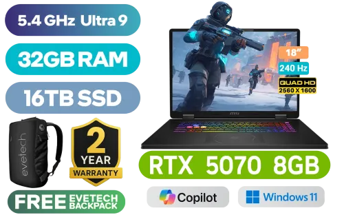 MSI Crosshair 18 HX AI A2XWGKG Intel Core Ultra 9 275HX up to 5.4GHz Processor, 76MB Cache, 24x Cores, 24x Threads / 32GB DDR5 RAM / 16TB Ultra-Fast NVMe SSD / 18” QHD+ (2560x1600) 240Hz Anti-Glare IPS-Level Display / NVIDIA GeForce RTX 5070 8GB GDDR7 Dedicated Graphics / Windows 11 Home (64bit) / Intel WiFi 6E AX211 Wireless LAN / Bluetooth 5.3 / 720p HD Web Camera / 3 x USB Type-A / 1 x USB Type-C (Thunderbolt 4, DisplayPort, Power Delivery) / 1 x HDMI 2.1 / 1x RJ-45 / 1x Headphone and Microphone Combo Jack / 2x 2W Speakers / RGB Backlit Keyboard / 2 Years Warranty / MSI Crosshair 18 HX AI A2XWGKG Intel Core Ultra 9 RTX 5070 Gaming Laptop DealMSI Crosshair 18 HX AI A2XWGKG Intel Core Ultra 9 275HX up to 5.4GHz Processor, 76MB Cache, 24x Cores, 24x Threads / 32GB DDR5 RAM / 16TB Ultra-Fast NVMe SSD / 18” QHD+ (2560x1600) 240Hz Anti-Glare IPS-Level Display / NVIDIA GeForce RTX 5070 8GB GDDR7 Dedicated Graphics / Windows 11 Home (64bit) / Intel WiFi 6E AX211 Wireless LAN / Bluetooth 5.3 / 720p HD Web Camera / 3 x USB Type-A / 1 x USB Type-C (Thunderbolt 4, DisplayPort, Power Delivery) / 1 x HDMI 2.1 / 1x RJ-45 / 1x Headphone and Microphone Combo Jack / 2x 2W Speakers / RGB Backlit Keyboard / 2 Years Warranty / MSI Crosshair 18 HX AI A2XWGKG Intel Core Ultra 9 RTX 5070 Gaming Laptop Deal [Crosshair-18-HX-AI-A2XWGKG-051ZA/16TB] / [+] GET FREE EVETECH NEO Premium Gaming Backpack / [+]Get Resident Evil: Requiem with select GeForce RTX 50 Series (Standard Edition)+ FREE DELIVERY !