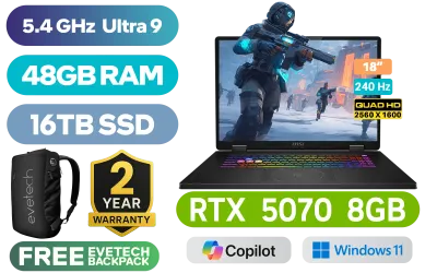 MSI Crosshair 18 HX AI A2XWGKG Intel Core Ultra 9 275HX up to 5.4GHz Processor, 76MB Cache, 24x Cores, 24x Threads / 48GB DDR5 RAM / 16TB Ultra-Fast NVMe SSD / 18ā QHD+ (2560x1600) 240Hz Anti-Glare IPS-Level Display / NVIDIA GeForce RTX 5070 8GB GDDR7 Dedicated Graphics / Windows 11 Home (64bit) / Intel WiFi 6E AX211 Wireless LAN / Bluetooth 5.3 / 720p HD Web Camera / 3 x USB Type-A / 1 x USB Type-C (Thunderbolt 4, DisplayPort, Power Delivery) / 1 x HDMI 2.1 / 1x RJ-45 / 1x Headphone and Microphone Combo Jack / 2x 2W Speakers / RGB Backlit Keyboard / 2 Years Warranty / MSI Crosshair 18 HX AI A2XWGKG Intel Core Ultra 9 RTX 5070 Gaming Laptop DealMSI Crosshair 18 HX AI A2XWGKG Intel Core Ultra 9 275HX up to 5.4GHz Processor, 76MB Cache, 24x Cores, 24x Threads / 48GB DDR5 RAM / 16TB Ultra-Fast NVMe SSD / 18ā QHD+ (2560x1600) 240Hz Anti-Glare IPS-Level Display / NVIDIA GeForce RTX 5070 8GB GDDR7 Dedicated Graphics / Windows 11 Home (64bit) / Intel WiFi 6E AX211 Wireless LAN / Bluetooth 5.3 / 720p HD Web Camera / 3 x USB Type-A / 1 x USB Type-C (Thunderbolt 4, DisplayPort, Power Delivery) / 1 x HDMI 2.1 / 1x RJ-45 / 1x Headphone and Microphone Combo Jack / 2x 2W Speakers / RGB Backlit Keyboard / 2 Years Warranty / MSI Crosshair 18 HX AI A2XWGKG Intel Core Ultra 9 RTX 5070 Gaming Laptop Deal [Crosshair-18-HX-AI-A2XWGKG-051ZA/48GB/16TB] / [+] GET FREE EVETECH NEO Premium Gaming Backpack / [+]Get Resident Evil Requiem with select GeForce RTX 50 Series (Standard Edition)+ FREE DELIVERY !