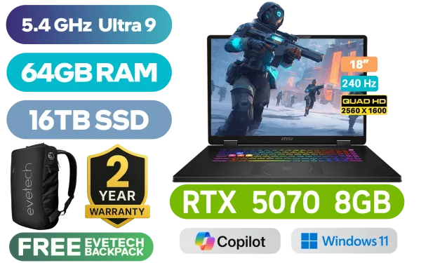 MSI Crosshair 18 HX AI A2XWGKG Intel Core Ultra 9 275HX up to 5.4GHz Processor, 76MB Cache, 24x Cores, 24x Threads / 64GB DDR5 RAM / 16TB Ultra-Fast NVMe SSD / 18” QHD+ (2560x1600) 240Hz Anti-Glare IPS-Level Display / NVIDIA GeForce RTX 5070 8GB GDDR7 Dedicated Graphics / Windows 11 Home (64bit) / Intel WiFi 6E AX211 Wireless LAN / Bluetooth 5.3 / 720p HD Web Camera / 3 x USB Type-A / 1 x USB Type-C (Thunderbolt 4, DisplayPort, Power Delivery) / 1 x HDMI 2.1 / 1x RJ-45 / 1x Headphone and Microphone Combo Jack / 2x 2W Speakers / RGB Backlit Keyboard / 2 Years Warranty / MSI Crosshair 18 HX AI A2XWGKG Intel Core Ultra 9 RTX 5070 Gaming Laptop DealMSI Crosshair 18 HX AI A2XWGKG Intel Core Ultra 9 275HX up to 5.4GHz Processor, 76MB Cache, 24x Cores, 24x Threads / 64GB DDR5 RAM / 16TB Ultra-Fast NVMe SSD / 18” QHD+ (2560x1600) 240Hz Anti-Glare IPS-Level Display / NVIDIA GeForce RTX 5070 8GB GDDR7 Dedicated Graphics / Windows 11 Home (64bit) / Intel WiFi 6E AX211 Wireless LAN / Bluetooth 5.3 / 720p HD Web Camera / 3 x USB Type-A / 1 x USB Type-C (Thunderbolt 4, DisplayPort, Power Delivery) / 1 x HDMI 2.1 / 1x RJ-45 / 1x Headphone and Microphone Combo Jack / 2x 2W Speakers / RGB Backlit Keyboard / 2 Years Warranty / MSI Crosshair 18 HX AI A2XWGKG Intel Core Ultra 9 RTX 5070 Gaming Laptop Deal [Crosshair-18-HX-AI-A2XWGKG-051ZA/64GB/16TB] / [+] GET FREE EVETECH NEO Premium Gaming Backpack / [+]Get Resident Evil Requiem with select GeForce RTX 50 Series (Standard Edition)+ FREE DELIVERY !