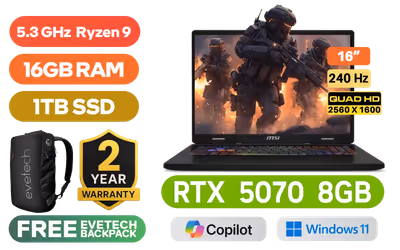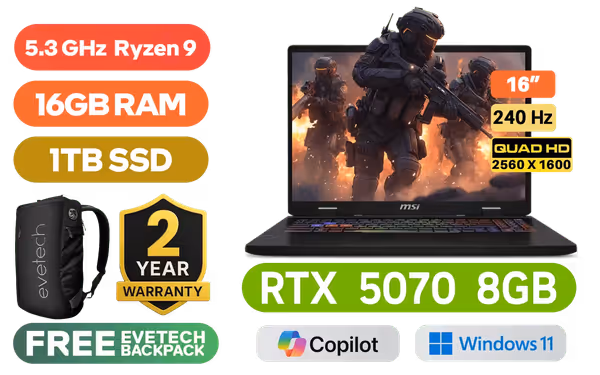 MSI Crosshair A16 HX D8WGKG AMD Ryzen 9 8940HX up to 5.3GHz Processor, 80MB Cache, 16x Cores, 32x Threads / 16GB DDR5 RAM / 1TB Ultra-Fast NVMe SSD / 16" QHD+ (2560x1600) 240Hz, IPS-Level Display / NVIDIA GeForce RTX 5070 8GB GDDR7 Dedicated Graphics / 720p HD Web Camera / Windows 11 Home (64bit) / Bluetooth 5.3 / RZ616 Wi-Fi 6E 802.11ax Wireless LAN / 3 x USB 3.2 Type-A / 1 x USB 3.2 Type-C (DisplayPort™/ Power Delivery 3.0) / 1 x HDMI 2.1 / RJ-45 / 1x Headphone and Microphone Combo Jack / Nahimic Audio by Steelseries / RGB Backlit Keyboard / 2 Years MSI Warranty / MSI Crosshair A16 HX D8WGKG AMD Ryzen 9 RTX 5070 Gaming LaptopMSI Crosshair A16 HX D8WGKG AMD Ryzen 9 8940HX up to 5.3GHz Processor, 80MB Cache, 16x Cores, 32x Threads / 16GB DDR5 RAM / 1TB Ultra-Fast NVMe SSD / 16" QHD+ (2560x1600) 240Hz, IPS-Level Display / NVIDIA GeForce RTX 5070 8GB GDDR7 Dedicated Graphics / 720p HD Web Camera / Windows 11 Home (64bit) / Bluetooth 5.3 / RZ616 Wi-Fi 6E 802.11ax Wireless LAN / 3 x USB 3.2 Type-A / 1 x USB 3.2 Type-C (DisplayPort™/ Power Delivery 3.0) / 1 x HDMI 2.1 / RJ-45 / 1x Headphone and Microphone Combo Jack / Nahimic Audio by Steelseries / RGB Backlit Keyboard / 2 Years MSI Warranty / MSI Crosshair A16 HX D8WGKG AMD Ryzen 9 RTX 5070 Gaming Laptop [MSI-Crosshair-A16-HX-D8WGKG-054ZA] / [+] GET FREE EVETECH NEO Premium Gaming Backpack / [+] Get PRAGMATA with select GeForce RTX 50 Series + FREE DELIVERY !