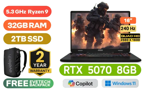 MSI Crosshair A16 HX D8WGKG AMD Ryzen 9 8940HX up to 5.3GHz Processor, 80MB Cache, 16x Cores, 32x Threads / 32GB DDR5 RAM / 2TB Ultra-Fast NVMe SSD / 16" QHD+ (2560x1600) 240Hz, IPS-Level Display / NVIDIA GeForce RTX 5070 8GB GDDR7 Dedicated Graphics / 720p HD Web Camera / Windows 11 Home (64bit) / Bluetooth 5.3 / RZ616 Wi-Fi 6E 802.11ax Wireless LAN / 3 x USB 3.2 Type-A / 1 x USB 3.2 Type-C (DisplayPort™/ Power Delivery 3.0) / 1 x HDMI 2.1 / RJ-45 / 1x Headphone and Microphone Combo Jack / Nahimic Audio by Steelseries / RGB Backlit Keyboard / 2 Years MSI Warranty / MSI Crosshair A16 HX D8WGKG AMD Ryzen 9 RTX 5070 Gaming LaptopMSI Crosshair A16 HX D8WGKG AMD Ryzen 9 8940HX up to 5.3GHz Processor, 80MB Cache, 16x Cores, 32x Threads / 32GB DDR5 RAM / 2TB Ultra-Fast NVMe SSD / 16" QHD+ (2560x1600) 240Hz, IPS-Level Display / NVIDIA GeForce RTX 5070 8GB GDDR7 Dedicated Graphics / 720p HD Web Camera / Windows 11 Home (64bit) / Bluetooth 5.3 / RZ616 Wi-Fi 6E 802.11ax Wireless LAN / 3 x USB 3.2 Type-A / 1 x USB 3.2 Type-C (DisplayPort™/ Power Delivery 3.0) / 1 x HDMI 2.1 / RJ-45 / 1x Headphone and Microphone Combo Jack / Nahimic Audio by Steelseries / RGB Backlit Keyboard / 2 Years MSI Warranty / MSI Crosshair A16 HX D8WGKG AMD Ryzen 9 RTX 5070 Gaming Laptop [MSI-Crosshair-A16-HX-D8WGKG-054ZA/32GB/2TB] / [+] GET FREE EVETECH NEO Premium Gaming Backpack / [+]Get Resident Evil: Requiem with select GeForce RTX 50 Series (Standard Edition)+ FREE DELIVERY !