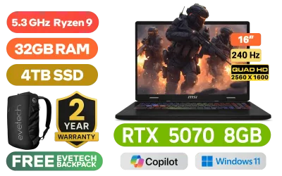 MSI Crosshair A16 HX D8WGKG AMD Ryzen 9 8940HX up to 5.3GHz Processor, 80MB Cache, 16x Cores, 32x Threads / 32GB DDR5 RAM / 4TB Ultra-Fast NVMe SSD / 16" QHD+ (2560x1600) 240Hz, IPS-Level Display / NVIDIA GeForce RTX 5070 8GB GDDR7 Dedicated Graphics / 720p HD Web Camera / Windows 11 Home (64bit) / Bluetooth 5.3 / RZ616 Wi-Fi 6E 802.11ax Wireless LAN / 3 x USB 3.2 Type-A / 1 x USB 3.2 Type-C (DisplayPort™/ Power Delivery 3.0) / 1 x HDMI 2.1 / RJ-45 / 1x Headphone and Microphone Combo Jack / Nahimic Audio by Steelseries / RGB Backlit Keyboard / 2 Years MSI Warranty / MSI Crosshair A16 HX D8WGKG AMD Ryzen 9 RTX 5070 Gaming LaptopMSI Crosshair A16 HX D8WGKG AMD Ryzen 9 8940HX up to 5.3GHz Processor, 80MB Cache, 16x Cores, 32x Threads / 32GB DDR5 RAM / 4TB Ultra-Fast NVMe SSD / 16" QHD+ (2560x1600) 240Hz, IPS-Level Display / NVIDIA GeForce RTX 5070 8GB GDDR7 Dedicated Graphics / 720p HD Web Camera / Windows 11 Home (64bit) / Bluetooth 5.3 / RZ616 Wi-Fi 6E 802.11ax Wireless LAN / 3 x USB 3.2 Type-A / 1 x USB 3.2 Type-C (DisplayPort™/ Power Delivery 3.0) / 1 x HDMI 2.1 / RJ-45 / 1x Headphone and Microphone Combo Jack / Nahimic Audio by Steelseries / RGB Backlit Keyboard / 2 Years MSI Warranty / MSI Crosshair A16 HX D8WGKG AMD Ryzen 9 RTX 5070 Gaming Laptop [MSI-Crosshair-A16-HX-D8WGKG-054ZA/32GB/4TB ] / [+] GET FREE EVETECH NEO Premium Gaming Backpack / [+]Get Resident Evil Requiem with select GeForce RTX 50 Series (Standard Edition)+ FREE DELIVERY !