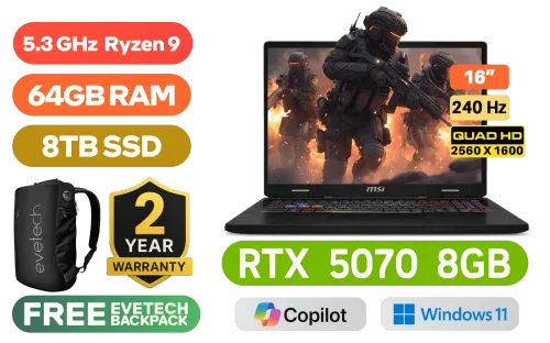 MSI Crosshair A16 HX D8WGKG AMD Ryzen 9 8940HX up to 5.3GHz Processor, 80MB Cache, 16x Cores, 32x Threads / 64GB DDR5 RAM / 8TB Ultra-Fast NVMe SSD / 16" QHD+ (2560x1600) 240Hz, IPS-Level Display / NVIDIA GeForce RTX 5070 8GB GDDR7 Dedicated Graphics / 720p HD Web Camera / Windows 11 Home (64bit) / Bluetooth 5.3 / RZ616 Wi-Fi 6E 802.11ax Wireless LAN / 3 x USB 3.2 Type-A / 1 x USB 3.2 Type-C (DisplayPort™/ Power Delivery 3.0) / 1 x HDMI 2.1 / RJ-45 / 1x Headphone and Microphone Combo Jack / Nahimic Audio by Steelseries / RGB Backlit Keyboard / 2 Years MSI Warranty / MSI Crosshair A16 HX D8WGKG AMD Ryzen 9 RTX 5070 Gaming LaptopMSI Crosshair A16 HX D8WGKG AMD Ryzen 9 8940HX up to 5.3GHz Processor, 80MB Cache, 16x Cores, 32x Threads / 64GB DDR5 RAM / 8TB Ultra-Fast NVMe SSD / 16" QHD+ (2560x1600) 240Hz, IPS-Level Display / NVIDIA GeForce RTX 5070 8GB GDDR7 Dedicated Graphics / 720p HD Web Camera / Windows 11 Home (64bit) / Bluetooth 5.3 / RZ616 Wi-Fi 6E 802.11ax Wireless LAN / 3 x USB 3.2 Type-A / 1 x USB 3.2 Type-C (DisplayPort™/ Power Delivery 3.0) / 1 x HDMI 2.1 / RJ-45 / 1x Headphone and Microphone Combo Jack / Nahimic Audio by Steelseries / RGB Backlit Keyboard / 2 Years MSI Warranty / MSI Crosshair A16 HX D8WGKG AMD Ryzen 9 RTX 5070 Gaming Laptop [MSI-Crosshair-A16-HX-D8WGKG-054ZA/64GB/8TB] / [+] GET FREE EVETECH NEO Premium Gaming Backpack / [+] Get PRAGMATA with select GeForce RTX 50 Series + FREE DELIVERY !