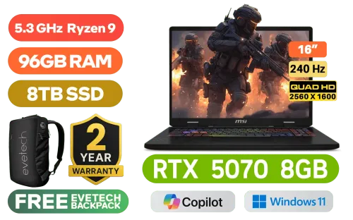 MSI Crosshair A16 HX D8WGKG AMD Ryzen 9 8940HX up to 5.3GHz Processor, 80MB Cache, 16x Cores, 32x Threads / 96GB DDR5 RAM / 8TB Ultra-Fast NVMe SSD / 16" QHD+ (2560x1600) 240Hz, IPS-Level Display / NVIDIA GeForce RTX 5070 8GB GDDR7 Dedicated Graphics / 720p HD Web Camera / Windows 11 Home (64bit) / Bluetooth 5.3 / RZ616 Wi-Fi 6E 802.11ax Wireless LAN / 3 x USB 3.2 Type-A / 1 x USB 3.2 Type-C (DisplayPort™/ Power Delivery 3.0) / 1 x HDMI 2.1 / RJ-45 / 1x Headphone and Microphone Combo Jack / Nahimic Audio by Steelseries / RGB Backlit Keyboard / 2 Years MSI Warranty / MSI Crosshair A16 HX D8WGKG AMD Ryzen 9 RTX 5070 Gaming LaptopMSI Crosshair A16 HX D8WGKG AMD Ryzen 9 8940HX up to 5.3GHz Processor, 80MB Cache, 16x Cores, 32x Threads / 96GB DDR5 RAM / 8TB Ultra-Fast NVMe SSD / 16" QHD+ (2560x1600) 240Hz, IPS-Level Display / NVIDIA GeForce RTX 5070 8GB GDDR7 Dedicated Graphics / 720p HD Web Camera / Windows 11 Home (64bit) / Bluetooth 5.3 / RZ616 Wi-Fi 6E 802.11ax Wireless LAN / 3 x USB 3.2 Type-A / 1 x USB 3.2 Type-C (DisplayPort™/ Power Delivery 3.0) / 1 x HDMI 2.1 / RJ-45 / 1x Headphone and Microphone Combo Jack / Nahimic Audio by Steelseries / RGB Backlit Keyboard / 2 Years MSI Warranty / MSI Crosshair A16 HX D8WGKG AMD Ryzen 9 RTX 5070 Gaming Laptop [MSI-Crosshair-A16-HX-D8WGKG-054ZA/96GB/8TB] / [+] GET FREE EVETECH NEO Premium Gaming Backpack / [+]Get Resident Evil: Requiem with select GeForce RTX 50 Series (Standard Edition)+ FREE DELIVERY !