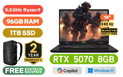 MSI Crosshair A16 HX D8WGKG AMD Ryzen 9 8940HX up to 5.3GHz Processor, 80MB Cache, 16x Cores, 32x Threads / 96GB DDR5 RAM / 1TB Ultra-Fast NVMe SSD / 16" QHD+ (2560x1600) 240Hz, IPS-Level Display / NVIDIA GeForce RTX 5070 8GB GDDR7 Dedicated Graphics / 720p HD Web Camera / Windows 11 Home (64bit) / Bluetooth 5.3 / RZ616 Wi-Fi 6E 802.11ax Wireless LAN / 3 x USB 3.2 Type-A / 1 x USB 3.2 Type-C (DisplayPort™/ Power Delivery 3.0) / 1 x HDMI 2.1 / RJ-45 / 1x Headphone and Microphone Combo Jack / Nahimic Audio by Steelseries / RGB Backlit Keyboard / 2 Years MSI Warranty / MSI Crosshair A16 HX D8WGKG AMD Ryzen 9 RTX 5070 Gaming LaptopMSI Crosshair A16 HX D8WGKG AMD Ryzen 9 8940HX up to 5.3GHz Processor, 80MB Cache, 16x Cores, 32x Threads / 96GB DDR5 RAM / 1TB Ultra-Fast NVMe SSD / 16" QHD+ (2560x1600) 240Hz, IPS-Level Display / NVIDIA GeForce RTX 5070 8GB GDDR7 Dedicated Graphics / 720p HD Web Camera / Windows 11 Home (64bit) / Bluetooth 5.3 / RZ616 Wi-Fi 6E 802.11ax Wireless LAN / 3 x USB 3.2 Type-A / 1 x USB 3.2 Type-C (DisplayPort™/ Power Delivery 3.0) / 1 x HDMI 2.1 / RJ-45 / 1x Headphone and Microphone Combo Jack / Nahimic Audio by Steelseries / RGB Backlit Keyboard / 2 Years MSI Warranty / MSI Crosshair A16 HX D8WGKG AMD Ryzen 9 RTX 5070 Gaming Laptop [MSI-Crosshair-A16-HX-D8WGKG-054ZA/96GB] / [+] GET FREE EVETECH NEO Premium Gaming Backpack / [+]Get Resident Evil Requiem with select GeForce RTX 50 Series (Standard Edition)+ FREE DELIVERY !