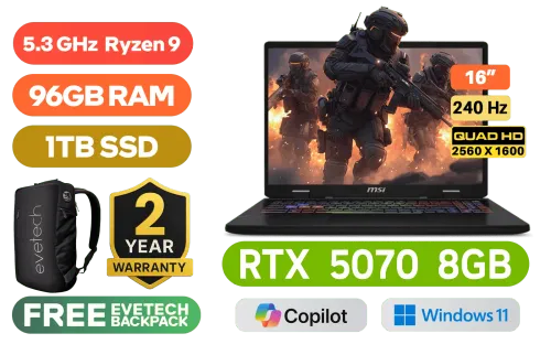 MSI Crosshair A16 HX D8WGKG AMD Ryzen 9 8940HX up to 5.3GHz Processor, 80MB Cache, 16x Cores, 32x Threads / 96GB DDR5 RAM / 1TB Ultra-Fast NVMe SSD / 16" QHD+ (2560x1600) 240Hz, IPS-Level Display / NVIDIA GeForce RTX 5070 8GB GDDR7 Dedicated Graphics / 720p HD Web Camera / Windows 11 Home (64bit) / Bluetooth 5.3 / RZ616 Wi-Fi 6E 802.11ax Wireless LAN / 3 x USB 3.2 Type-A / 1 x USB 3.2 Type-C (DisplayPort™/ Power Delivery 3.0) / 1 x HDMI 2.1 / RJ-45 / 1x Headphone and Microphone Combo Jack / Nahimic Audio by Steelseries / RGB Backlit Keyboard / 2 Years MSI Warranty / MSI Crosshair A16 HX D8WGKG AMD Ryzen 9 RTX 5070 Gaming LaptopMSI Crosshair A16 HX D8WGKG AMD Ryzen 9 8940HX up to 5.3GHz Processor, 80MB Cache, 16x Cores, 32x Threads / 96GB DDR5 RAM / 1TB Ultra-Fast NVMe SSD / 16" QHD+ (2560x1600) 240Hz, IPS-Level Display / NVIDIA GeForce RTX 5070 8GB GDDR7 Dedicated Graphics / 720p HD Web Camera / Windows 11 Home (64bit) / Bluetooth 5.3 / RZ616 Wi-Fi 6E 802.11ax Wireless LAN / 3 x USB 3.2 Type-A / 1 x USB 3.2 Type-C (DisplayPort™/ Power Delivery 3.0) / 1 x HDMI 2.1 / RJ-45 / 1x Headphone and Microphone Combo Jack / Nahimic Audio by Steelseries / RGB Backlit Keyboard / 2 Years MSI Warranty / MSI Crosshair A16 HX D8WGKG AMD Ryzen 9 RTX 5070 Gaming Laptop [MSI-Crosshair-A16-HX-D8WGKG-054ZA/96GB] / [+] GET FREE EVETECH NEO Premium Gaming Backpack / [+] Get PRAGMATA with select GeForce RTX 50 Series + FREE DELIVERY !