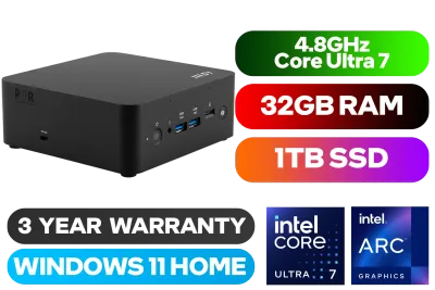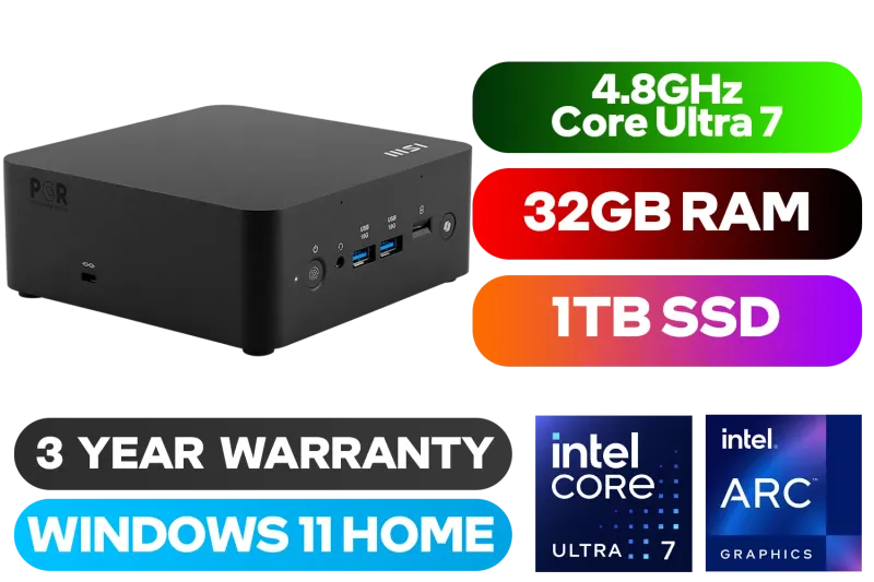 MSI Cubi NUC AI+ 2MG-027ZA Mini PC / Intel Core Ultra 7 258V (8x Cores, 8x Threads, 2.2GHz Base) up to 4.8GHz / 32GB LPDDR5x RAM / 1TB NVMe SSD / Intel Arc Integrated Graphics / Windows 11 Home / Intel Wi-Fi 6E AX211 / Bluetooth 5.3 / 4x USB Type-A / 2x USB Type-C (Supports ) / 2x RJ45 / 1x HDMI / 1x Microphone & Headphone Combo Jack / 1x Micro SD Card Reader / Fingerprint Reader / Copilot / External Power Button / 9S6-B20611-027