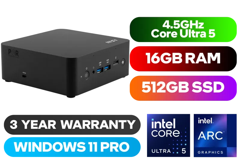 MSI Cubi NUC AI+ 2MG-041ZA Mini PC / Intel Core Ultra 5 226V (8x Cores, 8x Threads, 2.1GHz Base) up to 4.5GHz / 16GB LPDDR5x RAM / 512GB NVMe SSD / Intel Arc Integrated Graphics / Windows 11 Professional / Intel Wi-Fi 6E AX211 / Bluetooth 5.3 / 4x USB Type-A / 2x USB Type-C (Supports Thunderbolt 4, DisplayPort) / 2x RJ45 / 1x HDMI / 1x Microphone & Headphone Combo Jack / 1x Micro SD Card Reader / Fingerprint Reader / Copilot / External Power Button / 9S6-B20611-041
