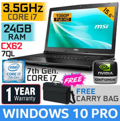 MSI CX62 7QL Intel 7th Gen Kabylake Core i7-7500U up to 3.50GHz CPU / 24GB DDR4 RAM / 1TB Hard Drive / 15.6" FHD 1920x1080 Anti-Glare Screen / nVidia GeForce 940MX 2GB Dedicated Graphics / <span style="color:blue; font-size: 18px;">Windows 10 Professional (64bit)</span> / Super Multi DVD RW / 720p HD Webcam / 802.11 ac Wireless LAN / Bluetooth v4.2 / 1 Year Warranty / 4 Speakers system delivering perfectly balanced and clear sound experience / Matrix Display supporting 4K output up to 2 external monitors / FREE MSI Notebook Carry Bag / Core i7 Laptop