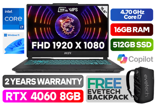 MSI Cyborg 15 A12VF 12th Gen Intel Core i7-12650H up to 4.7GHz Processor, 24MB Cache, 10x Cores, 16x Threads / 16GB DDR5 RAM / 512GB Ultra-Fast NVMe SSD / 15.6" FHD 1920x1080 144Hz IPS Level Display / NVIDIA GeForce RTX 4060 8GB GDDR6 Dedicated Graphics / Windows 11 Home (64bit) / HD Web Camera (30fps@720p) / Bluetooth v5.2 / Intel Wi-Fi 6 AX201 Wireless LAN / 2 x USB 3.2 Type-A / 1 x USB 3.2 Type-C (Displayport) / 1 x HDMI / 1x RJ 45 / 1x Mic-in/Headphone-out Combo Jack / Hi-Resolution Audio Boost + 2 x 2W Speaker / Blue Backlit Gaming Keyboard / 2 Year MSI Warranty / MSI Cyborg 15 A12VF Core i7 RTX 4060 Gaming Laptop DealMSI Cyborg 15 A12VF 12th Gen Intel Core i7-12650H up to 4.7GHz Processor, 24MB Cache, 10x Cores, 16x Threads / 16GB DDR5 RAM / 512GB Ultra-Fast NVMe SSD / 15.6" FHD 1920x1080 144Hz IPS Level Display / NVIDIA GeForce RTX 4060 8GB GDDR6 Dedicated Graphics / Windows 11 Home (64bit) / HD Web Camera (30fps@720p) / Bluetooth v5.2 / Intel Wi-Fi 6 AX201 Wireless LAN / 2 x USB 3.2 Type-A / 1 x USB 3.2 Type-C (Displayport) / 1 x HDMI / 1x RJ 45 / 1x Mic-in/Headphone-out Combo Jack / Hi-Resolution Audio Boost + 2 x 2W Speaker / Blue Backlit Gaming Keyboard / 2 Year MSI Warranty / MSI Cyborg 15 A12VF Core i7 RTX 4060 Gaming Laptop Deal [MSI-Cyborg-15-A12VF-085ZA] / [+] GET FREE EVETECH NEO Premium Gaming Backpack+ FREE DELIVERY !