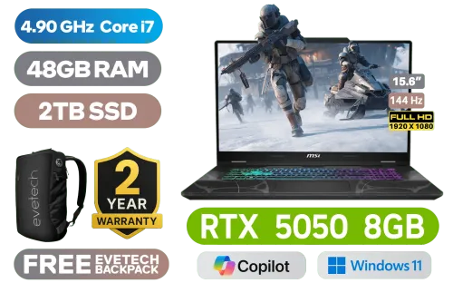 MSI Cyborg 15 B13WEKG Intel Core i7-13620H up to 4.90GHz Processor, 24MB Cache, 10x Cores, 16x Threads / 48GB DDR5 RAM / 2TB Ultra-Fast NVMe SSD / 15.6" FHD (1920 x 1080) 144Hz IPS-Level Display / NVIDIA GeForce RTX 5050 GDDR7 8GB Graphics / Windows 11 Home / Intel Wi-Fi 6E AX211 Wireless LAN / Bluetooth 5.3 / 720p HD Camera with Privacy Shutter / 2x USB Type-A / 1x USB Type-C (Supports DisplayPort / Power Delivery 3.0) / 1x HDMI / 1x RJ-45 / 1x Headphone & Microphone Combo Jack / RGB Backlit Gaming Keyboard / 2x 2W Speakers / 2 Years Warranty / MSI Cyborg 15 B13WEKG Intel Core i7 Gaming LaptopMSI Cyborg 15 B13WEKG Intel Core i7-13620H up to 4.90GHz Processor, 24MB Cache, 10x Cores, 16x Threads / 48GB DDR5 RAM / 2TB Ultra-Fast NVMe SSD / 15.6" FHD (1920 x 1080) 144Hz IPS-Level Display / NVIDIA GeForce RTX 5050 GDDR7 8GB Graphics / Windows 11 Home / Intel Wi-Fi 6E AX211 Wireless LAN / Bluetooth 5.3 / 720p HD Camera with Privacy Shutter / 2x USB Type-A / 1x USB Type-C (Supports DisplayPort / Power Delivery 3.0) / 1x HDMI / 1x RJ-45 / 1x Headphone & Microphone Combo Jack / RGB Backlit Gaming Keyboard / 2x 2W Speakers / 2 Years Warranty / MSI Cyborg 15 B13WEKG Intel Core i7 Gaming Laptop [Cyborg-15-B13WEKG-474ZA/48GB/2TB] / [+] GET FREE EVETECH NEO Premium Gaming Backpack+ FREE DELIVERY !