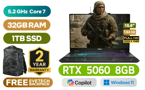 MSI Cyborg 15 B2RWFKG Intel® Core™ 7-240H up to 5.2GHz Processor, 24MB Cache, 10x Cores, 16x Threads / 32GB DDR5 RAM / 1TB Ultra-Fast NVMe SSD / 15.6" FHD (1920x1080) 144Hz IPS-Level Display / NVIDIA GeForce RTX 5060 8GB GDDR7 Dedicated Graphics / Windows 11 Home (64bit) / 720p HD Web Camera / Bluetooth 5.3 / Intel Wi-Fi 6E AX211 Wireless LAN / 2 x USB Type-A / 1 x USB Type-C (DisplayPort™/ Power Delivery 3.0) / 1 x HDMI / 1x RJ-45 / 1x Headphone and Microphone Combo Jack / 2x2w Speakers with DTS Audio / RGB Backlit Keyboard / 2 Years MSI Warranty / MSI Cyborg 15 B2RWFKG Intel® Core™ 7 RTX 5060 Gaming Laptop DealMSI Cyborg 15 B2RWFKG Intel® Core™ 7-240H up to 5.2GHz Processor, 24MB Cache, 10x Cores, 16x Threads / 32GB DDR5 RAM / 1TB Ultra-Fast NVMe SSD / 15.6" FHD (1920x1080) 144Hz IPS-Level Display / NVIDIA GeForce RTX 5060 8GB GDDR7 Dedicated Graphics / Windows 11 Home (64bit) / 720p HD Web Camera / Bluetooth 5.3 / Intel Wi-Fi 6E AX211 Wireless LAN / 2 x USB Type-A / 1 x USB Type-C (DisplayPort™/ Power Delivery 3.0) / 1 x HDMI / 1x RJ-45 / 1x Headphone and Microphone Combo Jack / 2x2w Speakers with DTS Audio / RGB Backlit Keyboard / 2 Years MSI Warranty / MSI Cyborg 15 B2RWFKG Intel® Core™ 7 RTX 5060 Gaming Laptop Deal [MSI-Cyborg-15-B2RWFKG-091ZA/32GB/1TB] / [+] GET FREE EVETECH DASH Premium Gaming Backpack+ FREE DELIVERY !