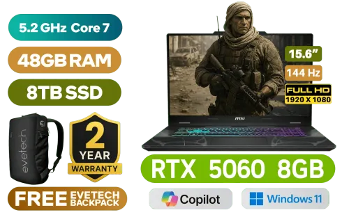 MSI Cyborg 15 B2RWFKG Intel® Core™ 7-240H up to 5.2GHz Processor, 24MB Cache, 10x Cores, 16x Threads / 48GB DDR5 RAM / 8TB Ultra-Fast NVMe SSD / 15.6" FHD (1920x1080) 144Hz IPS-Level Display / NVIDIA GeForce RTX 5060 8GB GDDR7 Dedicated Graphics / Windows 11 Home (64bit) / 720p HD Web Camera / Bluetooth 5.3 / Intel Wi-Fi 6E AX211 Wireless LAN / 2 x USB Type-A / 1 x USB Type-C (DisplayPort™/ Power Delivery 3.0) / 1 x HDMI / 1x RJ-45 / 1x Headphone and Microphone Combo Jack / 2x2w Speakers with DTS Audio / RGB Backlit Keyboard / 2 Years MSI Warranty / MSI Cyborg 15 B2RWFKG Intel® Core™ 7 RTX 5060 Gaming Laptop DealMSI Cyborg 15 B2RWFKG Intel® Core™ 7-240H up to 5.2GHz Processor, 24MB Cache, 10x Cores, 16x Threads / 48GB DDR5 RAM / 8TB Ultra-Fast NVMe SSD / 15.6" FHD (1920x1080) 144Hz IPS-Level Display / NVIDIA GeForce RTX 5060 8GB GDDR7 Dedicated Graphics / Windows 11 Home (64bit) / 720p HD Web Camera / Bluetooth 5.3 / Intel Wi-Fi 6E AX211 Wireless LAN / 2 x USB Type-A / 1 x USB Type-C (DisplayPort™/ Power Delivery 3.0) / 1 x HDMI / 1x RJ-45 / 1x Headphone and Microphone Combo Jack / 2x2w Speakers with DTS Audio / RGB Backlit Keyboard / 2 Years MSI Warranty / MSI Cyborg 15 B2RWFKG Intel® Core™ 7 RTX 5060 Gaming Laptop Deal [MSI-Cyborg-15-B2RWFKG-091ZA/48GB/8TB] / [+] GET FREE EVETECH DASH Premium Gaming Backpack+ FREE DELIVERY !