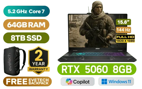 MSI Cyborg 15 B2RWFKG Intel® Core™ 7-240H up to 5.2GHz Processor, 24MB Cache, 10x Cores, 16x Threads / 64GB DDR5 RAM / 8TB Ultra-Fast NVMe SSD / 15.6" FHD (1920x1080) 144Hz IPS-Level Display / NVIDIA GeForce RTX 5060 8GB GDDR7 Dedicated Graphics / Windows 11 Home (64bit) / 720p HD Web Camera / Bluetooth 5.3 / Intel Wi-Fi 6E AX211 Wireless LAN / 2 x USB Type-A / 1 x USB Type-C (DisplayPort™/ Power Delivery 3.0) / 1 x HDMI / 1x RJ-45 / 1x Headphone and Microphone Combo Jack / 2x2w Speakers with DTS Audio / RGB Backlit Keyboard / 2 Years MSI Warranty / MSI Cyborg 15 B2RWFKG Intel® Core™ 7 RTX 5060 Gaming Laptop DealMSI Cyborg 15 B2RWFKG Intel® Core™ 7-240H up to 5.2GHz Processor, 24MB Cache, 10x Cores, 16x Threads / 64GB DDR5 RAM / 8TB Ultra-Fast NVMe SSD / 15.6" FHD (1920x1080) 144Hz IPS-Level Display / NVIDIA GeForce RTX 5060 8GB GDDR7 Dedicated Graphics / Windows 11 Home (64bit) / 720p HD Web Camera / Bluetooth 5.3 / Intel Wi-Fi 6E AX211 Wireless LAN / 2 x USB Type-A / 1 x USB Type-C (DisplayPort™/ Power Delivery 3.0) / 1 x HDMI / 1x RJ-45 / 1x Headphone and Microphone Combo Jack / 2x2w Speakers with DTS Audio / RGB Backlit Keyboard / 2 Years MSI Warranty / MSI Cyborg 15 B2RWFKG Intel® Core™ 7 RTX 5060 Gaming Laptop Deal [MSI-Cyborg-15-B2RWFKG-091ZA/64GB/8TB] / [+] GET FREE EVETECH DASH Premium Gaming Backpack+ FREE DELIVERY !
