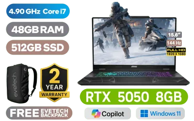 MSI Cyborg 15 B13WEKG Intel Core i7-13620H up to 4.90GHz Processor, 24MB Cache, 10x Cores, 16x Threads / 48GB DDR5 RAM / 512GB Ultra-Fast NVMe SSD / 15.6" FHD (1920 x 1080) 144Hz IPS-Level Display / NVIDIA GeForce RTX 5050 GDDR7 8GB Graphics / Windows 11 Home / Intel Wi-Fi 6E AX211 Wireless LAN / Bluetooth 5.3 / 720p HD Camera with Privacy Shutter / 2x USB Type-A / 1x USB Type-C (Supports DisplayPort / Power Delivery 3.0) / 1x HDMI / 1x RJ-45 / 1x Headphone & Microphone Combo Jack / RGB Backlit Gaming Keyboard / 2x 2W Speakers / 2 Years Warranty / MSI Cyborg 15 B13WEKG Intel Core i7 Gaming LaptopMSI Cyborg 15 B13WEKG Intel Core i7-13620H up to 4.90GHz Processor, 24MB Cache, 10x Cores, 16x Threads / 48GB DDR5 RAM / 512GB Ultra-Fast NVMe SSD / 15.6" FHD (1920 x 1080) 144Hz IPS-Level Display / NVIDIA GeForce RTX 5050 GDDR7 8GB Graphics / Windows 11 Home / Intel Wi-Fi 6E AX211 Wireless LAN / Bluetooth 5.3 / 720p HD Camera with Privacy Shutter / 2x USB Type-A / 1x USB Type-C (Supports DisplayPort / Power Delivery 3.0) / 1x HDMI / 1x RJ-45 / 1x Headphone & Microphone Combo Jack / RGB Backlit Gaming Keyboard / 2x 2W Speakers / 2 Years Warranty / MSI Cyborg 15 B13WEKG Intel Core i7 Gaming Laptop [Cyborg-15-B13WEKG-474ZA/48GB] / [+] GET FREE EVETECH NEO Premium Gaming Backpack+ FREE DELIVERY !